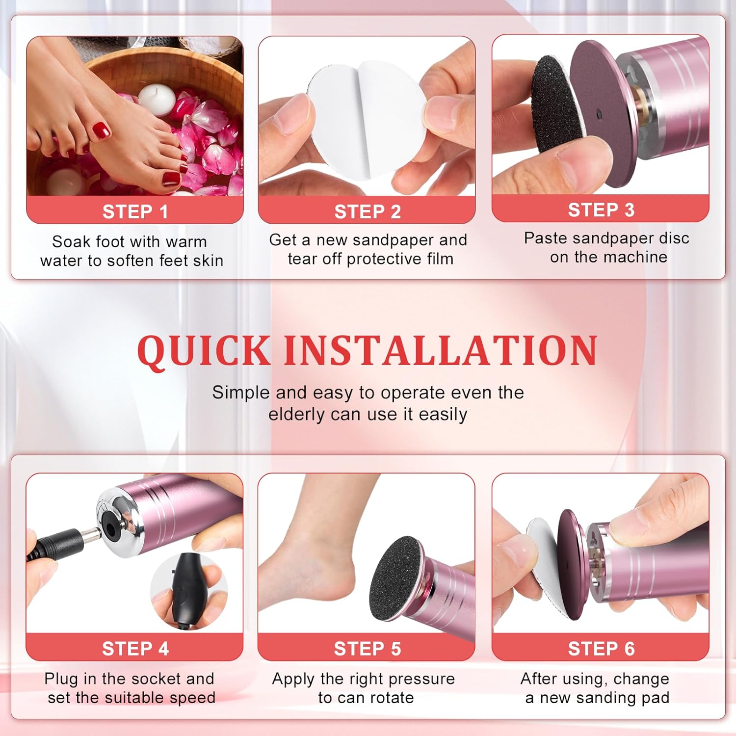 Replacement Sandpaper: Rlojru electric foot file comes with 60 replaceable sandpaper discs, 30 fine grit and 30 coarse grit. To use you simply peel off the sticker on the back, place it easily on the turntable and start our foot sander. The sandpaper discs can be discarded immediately after each use so you can replace them whenever you want.