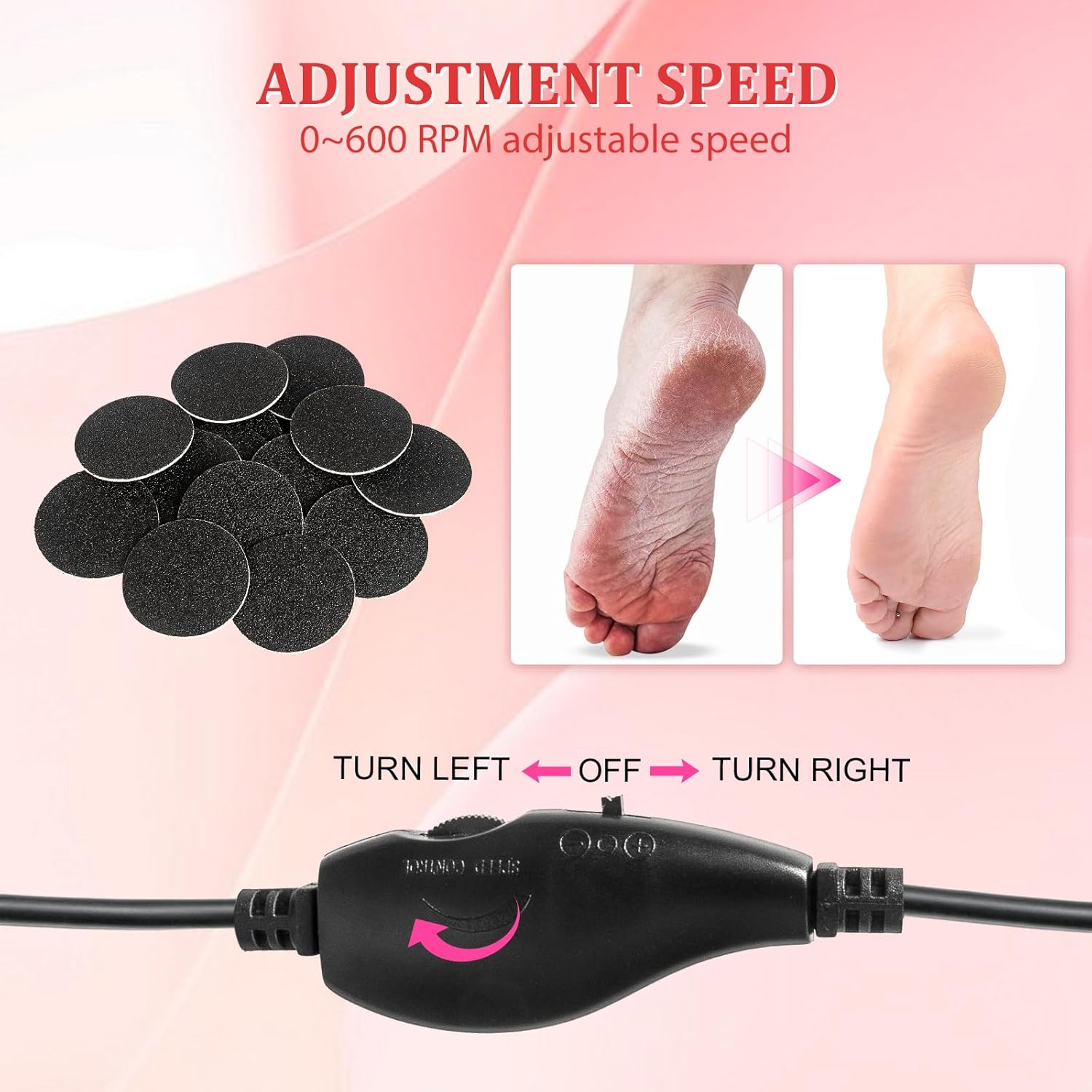 Adjustable Speed: Our electric foot file can reach speeds of up to 1000 rpm/min and can rotate 360°. Rlojru foot sander has two switches, one to change the steering and one to adjust the speed. Our electric foot grinder is available in high and low speed modes. . You can choose the right steering and speed according to your comfort level and habit.