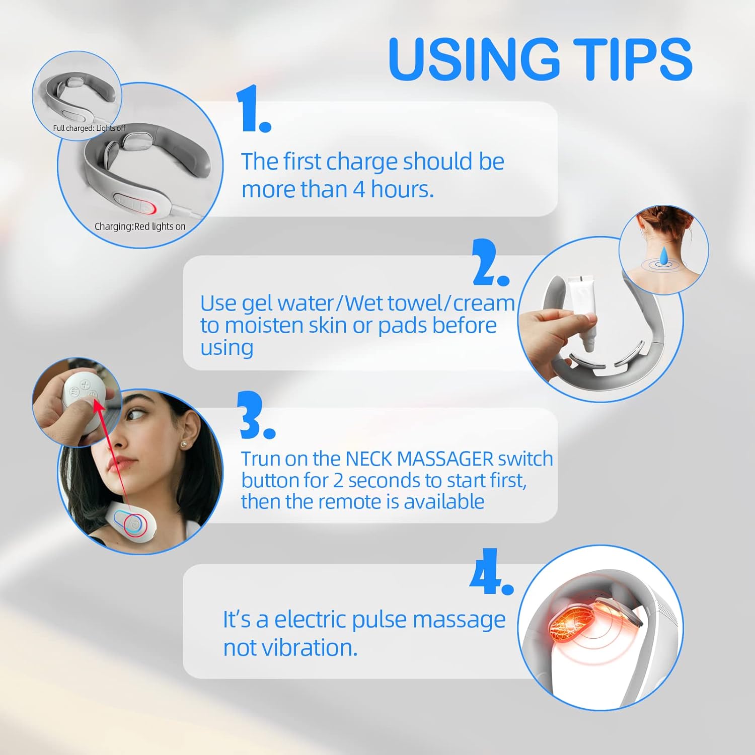 10 Modes and 15 Level Intensities: Please use a wet towel or cream on the neck skin for better massage before using .With 10 modes and 15 level intensity to meet your different needs with a remote control.Acupuncture,Kneading,knocking,tapping and shiatsu provides you with multiple massage demands