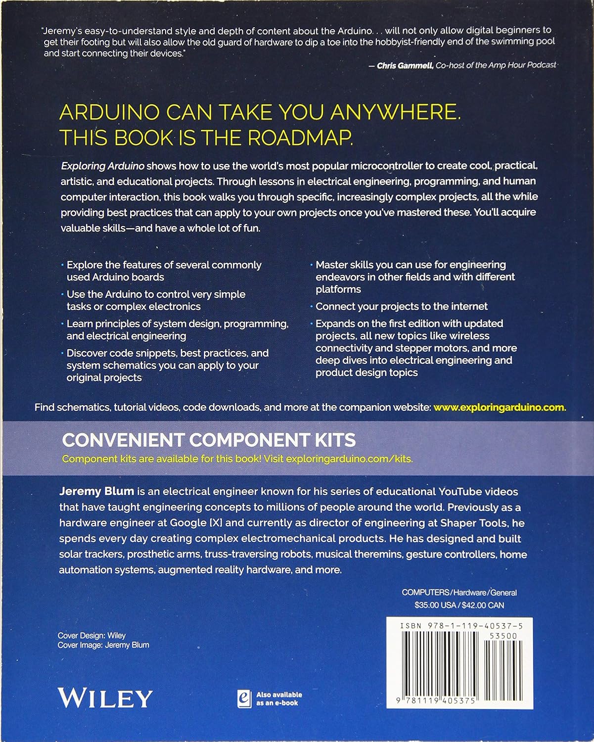 Exploring Arduino makes electrical engineering and embedded software accessible. Learn step by step everything you need to know about electrical engineering, programming, and human-computer interaction through a series of increasingly complex projects. Arduino guru Jeremy Blum walks you through each build, providing code snippets and schematics that will remain useful for future projects. Projects are accompanied by downloadable source code, tips and tricks, and video tutorials to help you master Arduino. You’ll gain the skills you need to develop your own microcontroller projects!