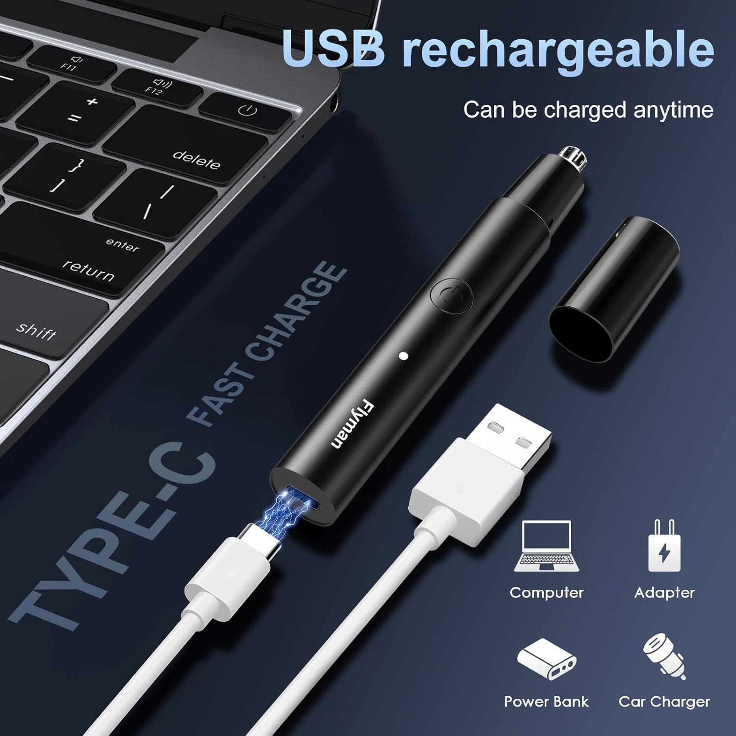 Rechargeable Battery, Long Standby Time. Charge the nose hair trimmer using the included USB C charging cable. Charge on the go, connecting the cable to a USB port, power bank, computer, or USB car charger. One charge powers the nose hair trimmer for up to 6 months.