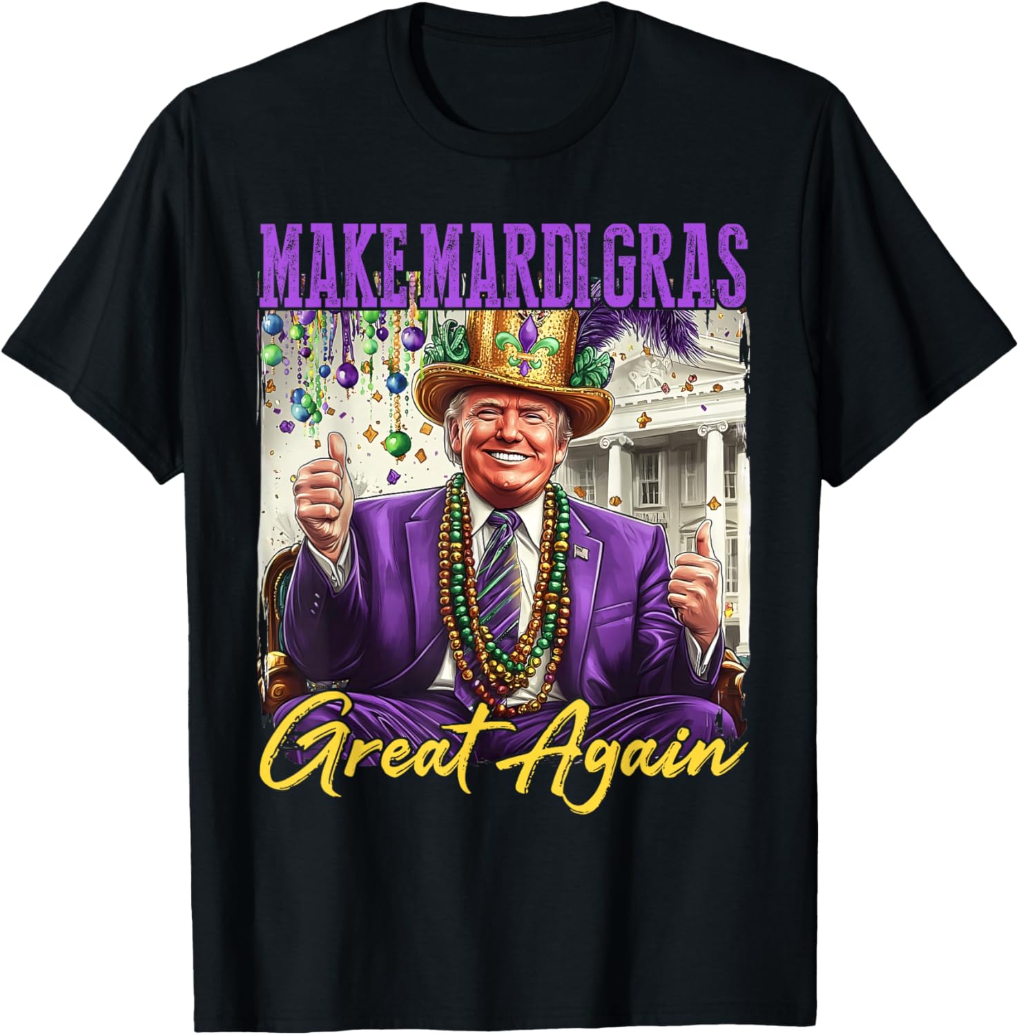 This unisex, all-season T-Shirt is a humorous must-have for Trump supporters and Mardi Gras enthusiasts. Crafted with a lightweight, straight fit, it features a black, short-sleeved design with a round neck and flat collar. The letter print showcases a playful Mardi Gras-themed image of Donald Trump, making it perfect for parades and parties. Machine washable for easy care.