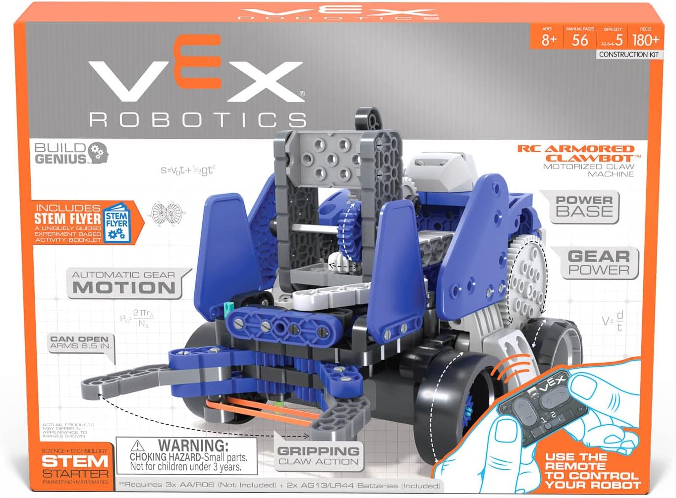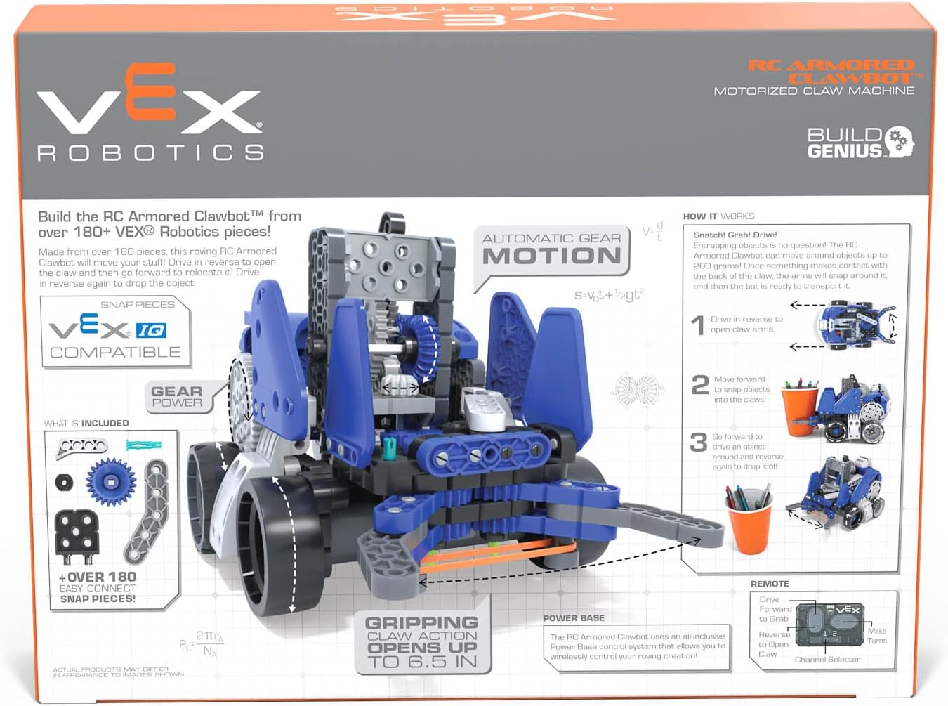 Nothing is ever out of reach for the VEX RC Armored Clawbot! Drive and steer the Clawbot with the IR remote. Bump into objects and pick them up with the bot claw. Once an object is retrieved, steer the Clawbot to where you want the object to be placed. Then simply hit reverse and leave the object in its new home.