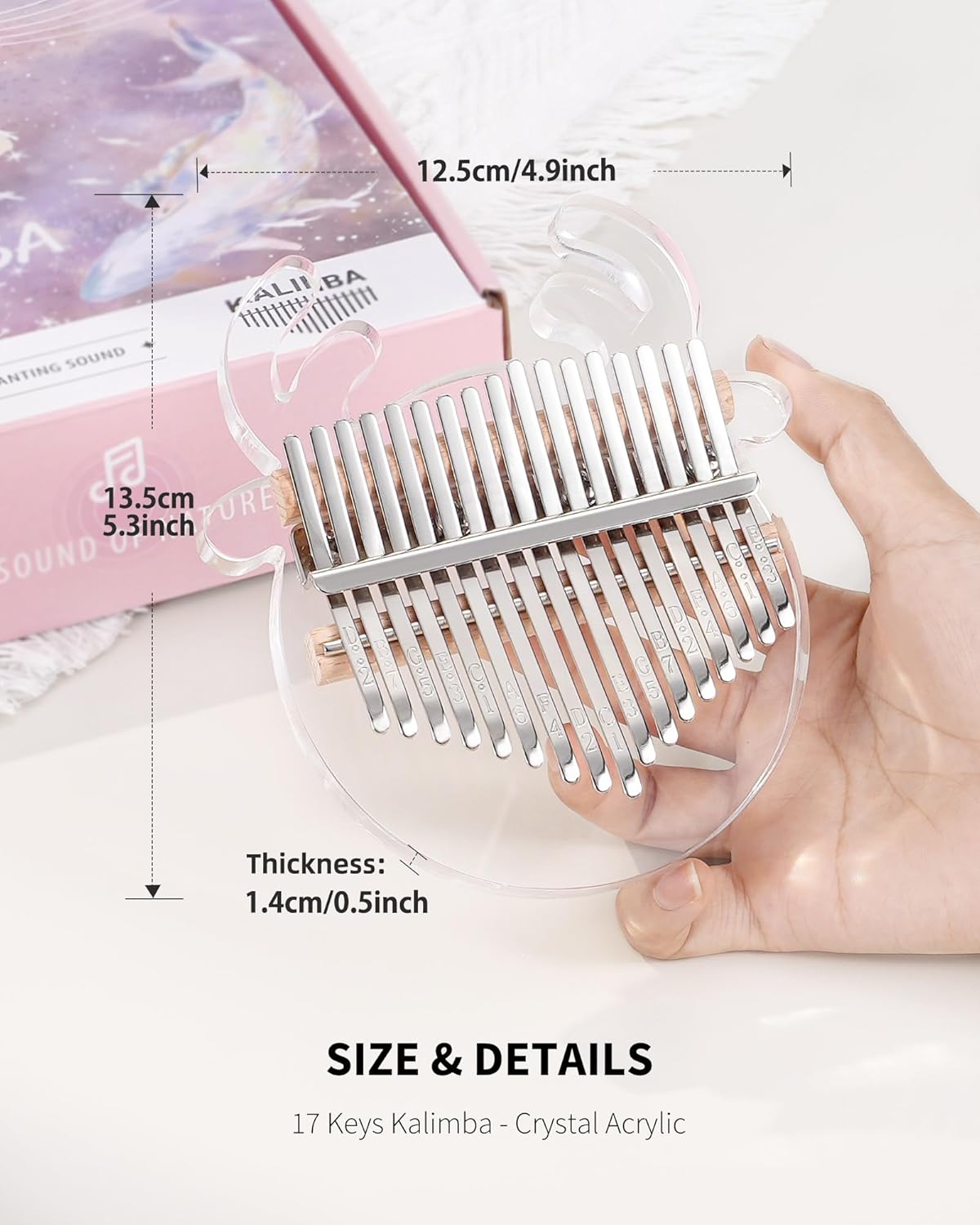 【Special Tone】: The cute Kalimba is made of clear crystal acrylic, carbon steel keys, and excellent craftsmanship, which will not scratch your hands. Unlike the heavy tone of the wooden hollow Kalimba, the solid material makes it more ethereal and healing.