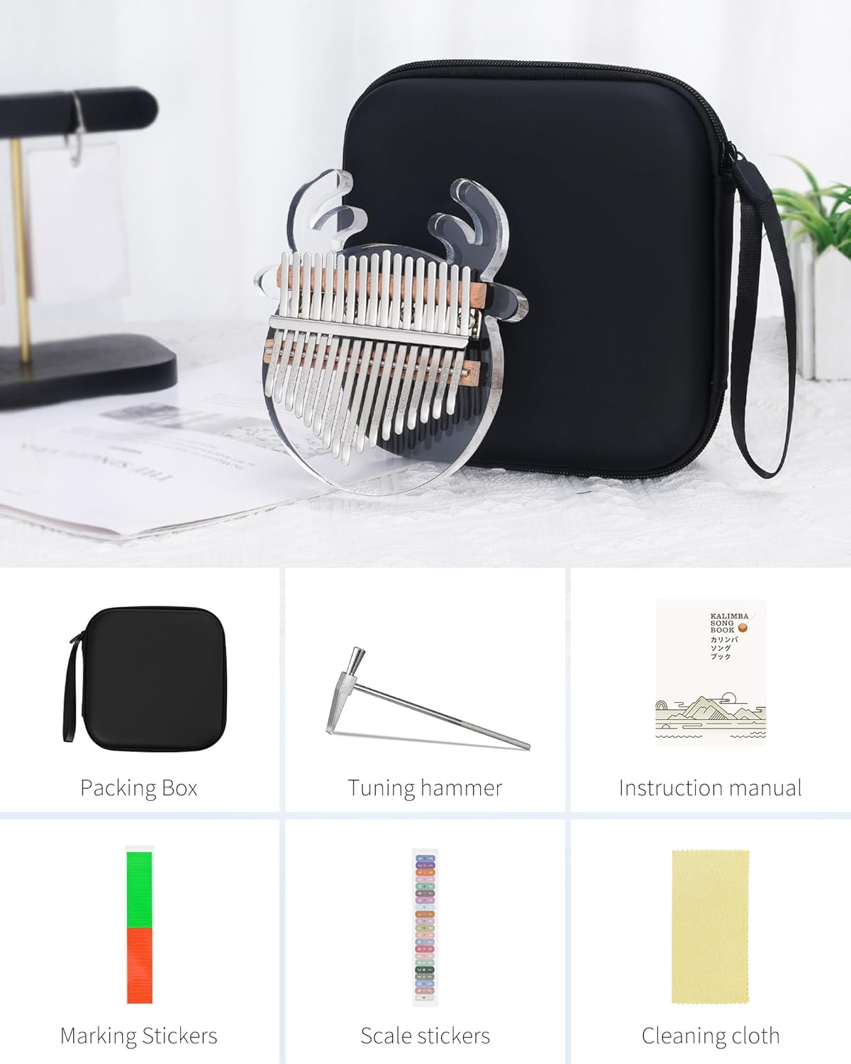 Package Includes: Transparent Thumb Piano*1, Protective Box*1, Tuning Hammer*1, Marking Sticker*1, Scale Sticker*1, Cleaning Cloth*1, User Manual*1, Outer Packing Color Box*1