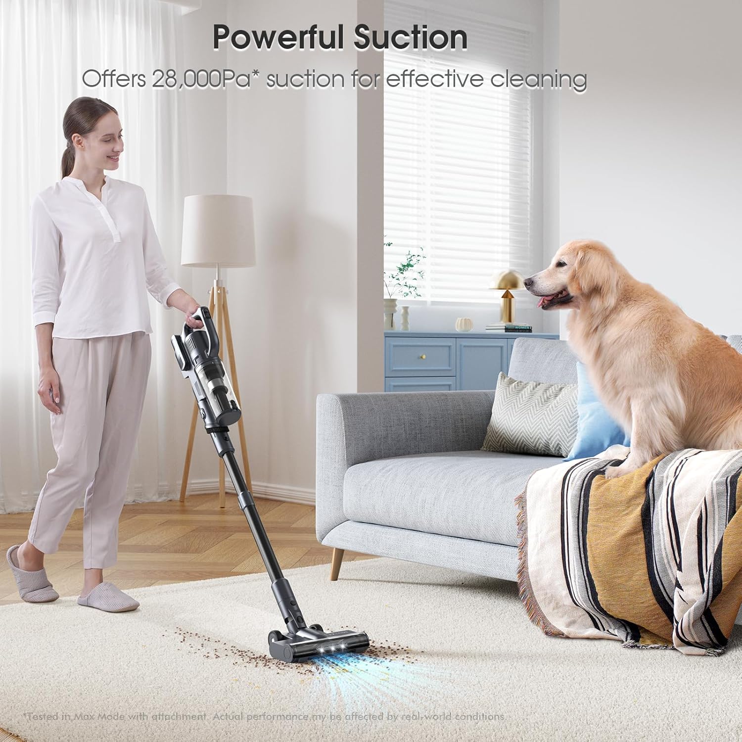 Powerful Suction for Deep Cleaning: The MIUZZY M243 cordless vacuum offers up to 28,000Pa suction power, easily lifting dust, dirt, and pet hair from all surfaces. Switch between Max, Medium, and Eco modes to meet your cleaning needs and save energy