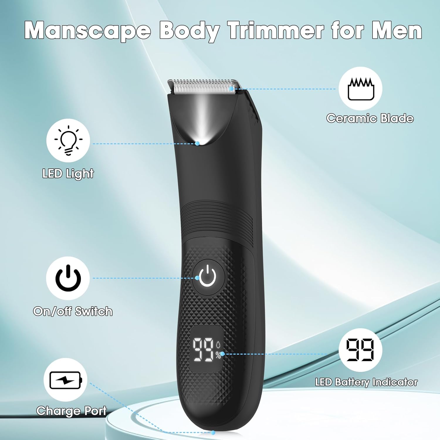 LED Light & Intelligent Display: With built-in LED lighting, this body hair trimmer illuminates every detail, ensuring a precise grooming experience even in low light conditions. LCD display for reminding the amount of power left in hair trimmer, showing when to charge.