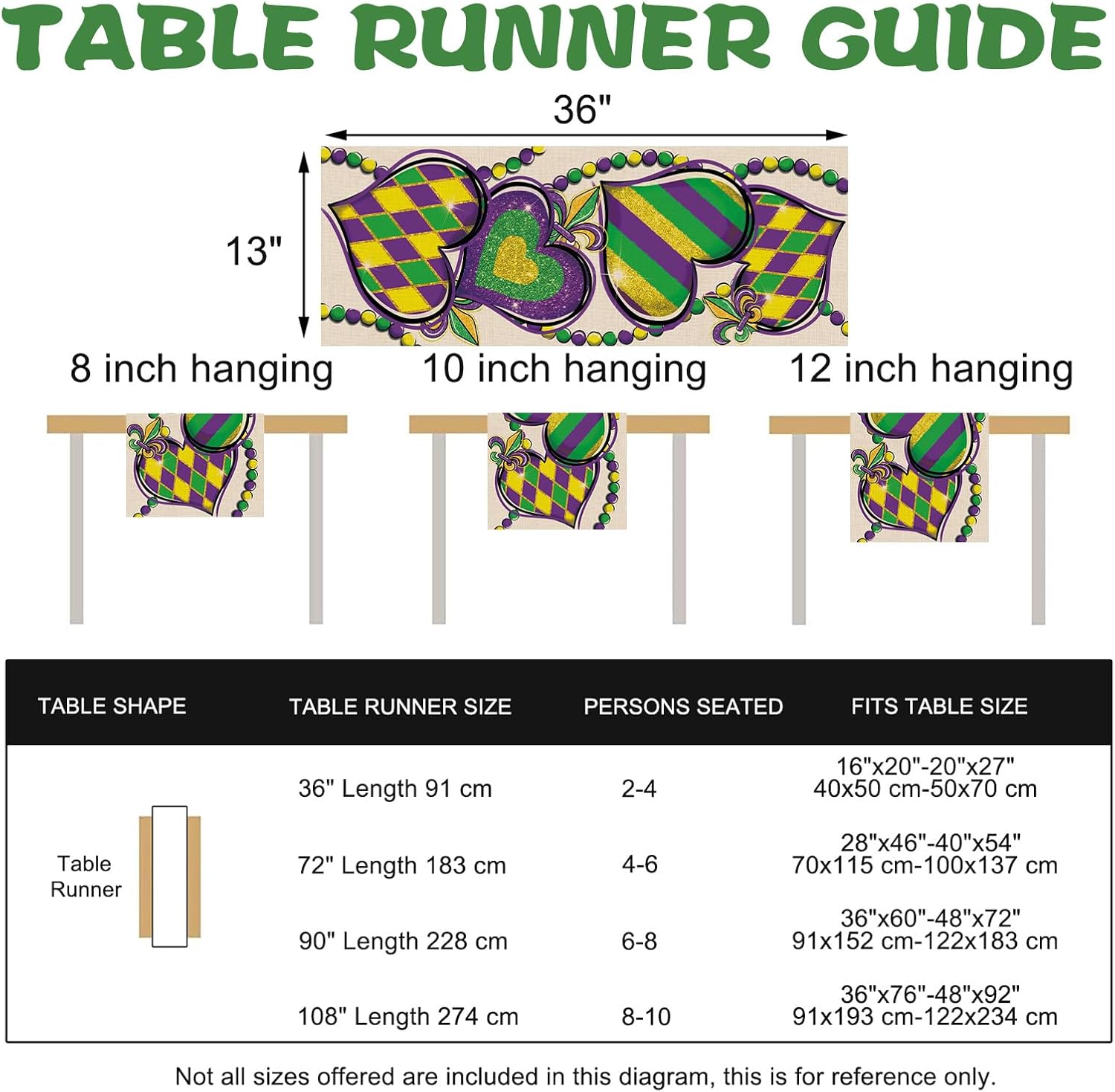 Uniquely Designed Table Runner: Our Mardi Gras tabletop runner is designed with the current elements to add style and vibrancy to your home. Table runner is printed with vivid love hearts, fleur de lis, beads, diamond, stripes patterns, which is the perfect decoration for Mardi Gras. Express your positive outlook on life by decorating your coffee table, dining table, buffet and kitchen with our seasonal table runners in a variety of themes