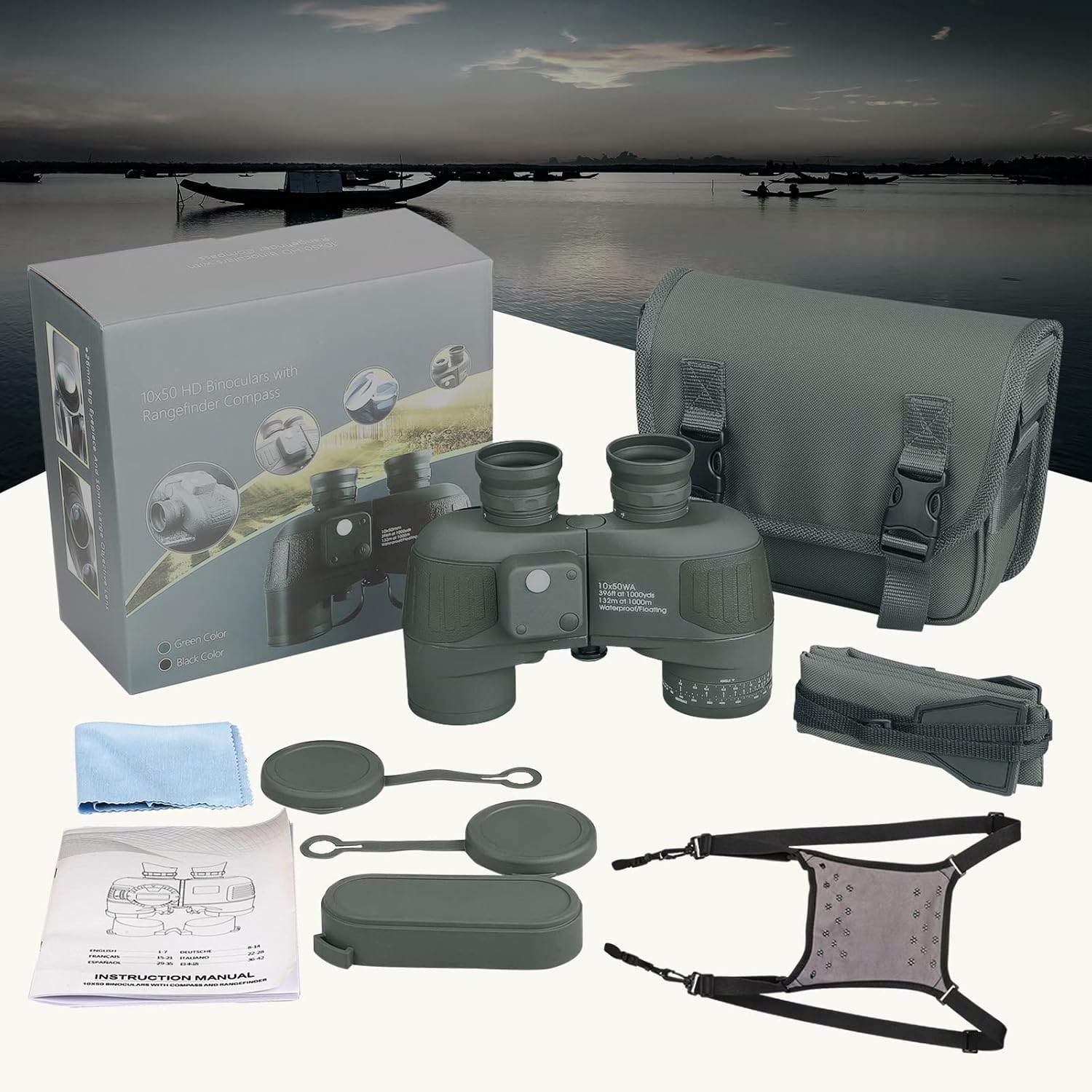 【Professional Marine Binoculars】10X50 binoculars provides 50mm large objective lense and 22mm eye relief, which offer a extra large view and comfortable observation. 6.8mm exit pupil, and field of view is 396 feet at 1000 yards / 132 meters at 1000 meters. With ±5 diopter left and right diopter ring, You can adjust the distance for better viewing without glasses and for fine focusing.