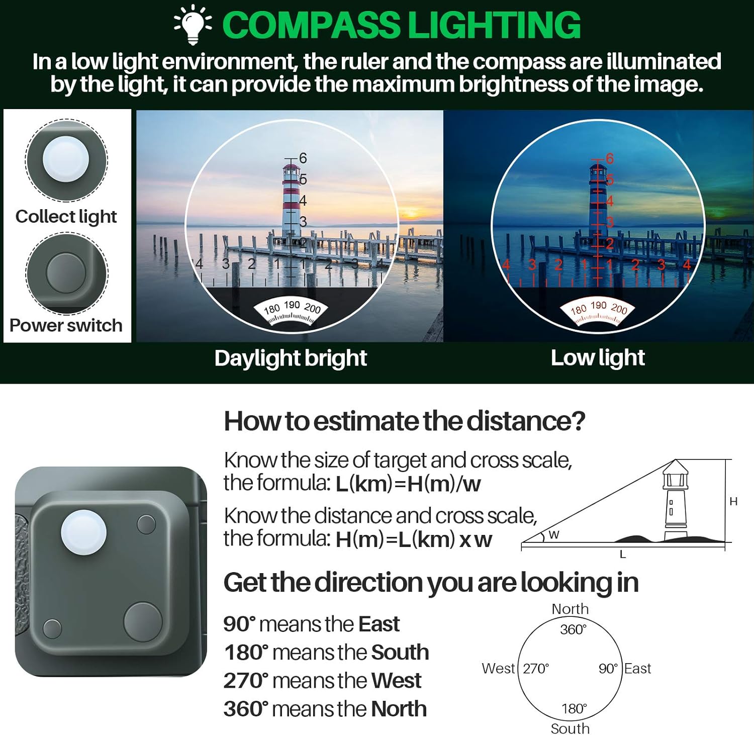 【Binoculars with Rangefinder Compass】Night vision binoculars illuminated compass built-in for direction location, with an internal rangefinder for calculate the distance and size of the object on the left eyepiece directly. The ruler and the compass illuminated by the light button, provides the maximum brightness of the image even in low light conditions(not totally dark).