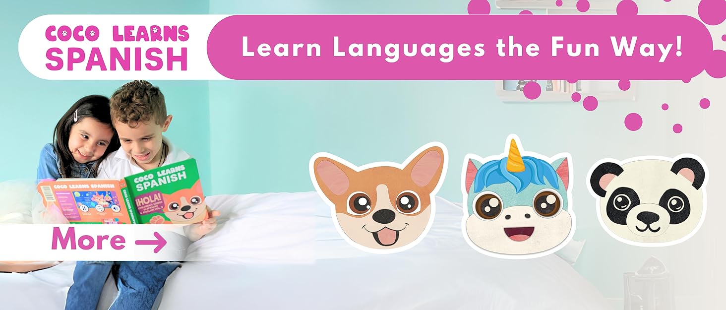 SUPPORTS EARLY LEARNING & EDUCATION. Coco Learns Spanish makes Spanish learning for kids joyful and natural. These bilingual interactive books are ideal Spanish baby books 0-6 months, Spanish board books for babies, and Spanish English children’s books. Help your child learn kindergarten Spanish, first words, and early vocabulary with these books for toddlers Spanish. Also perfect as Spanish books for toddlers 1-3, Spanish toddler books, and a fun baby book in Spanish. Son libros infantiles en español, libros en español para bebés, y juguetes musicales para niños de 1, 2, 3 años.