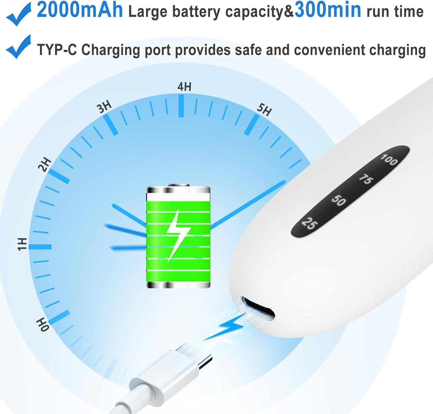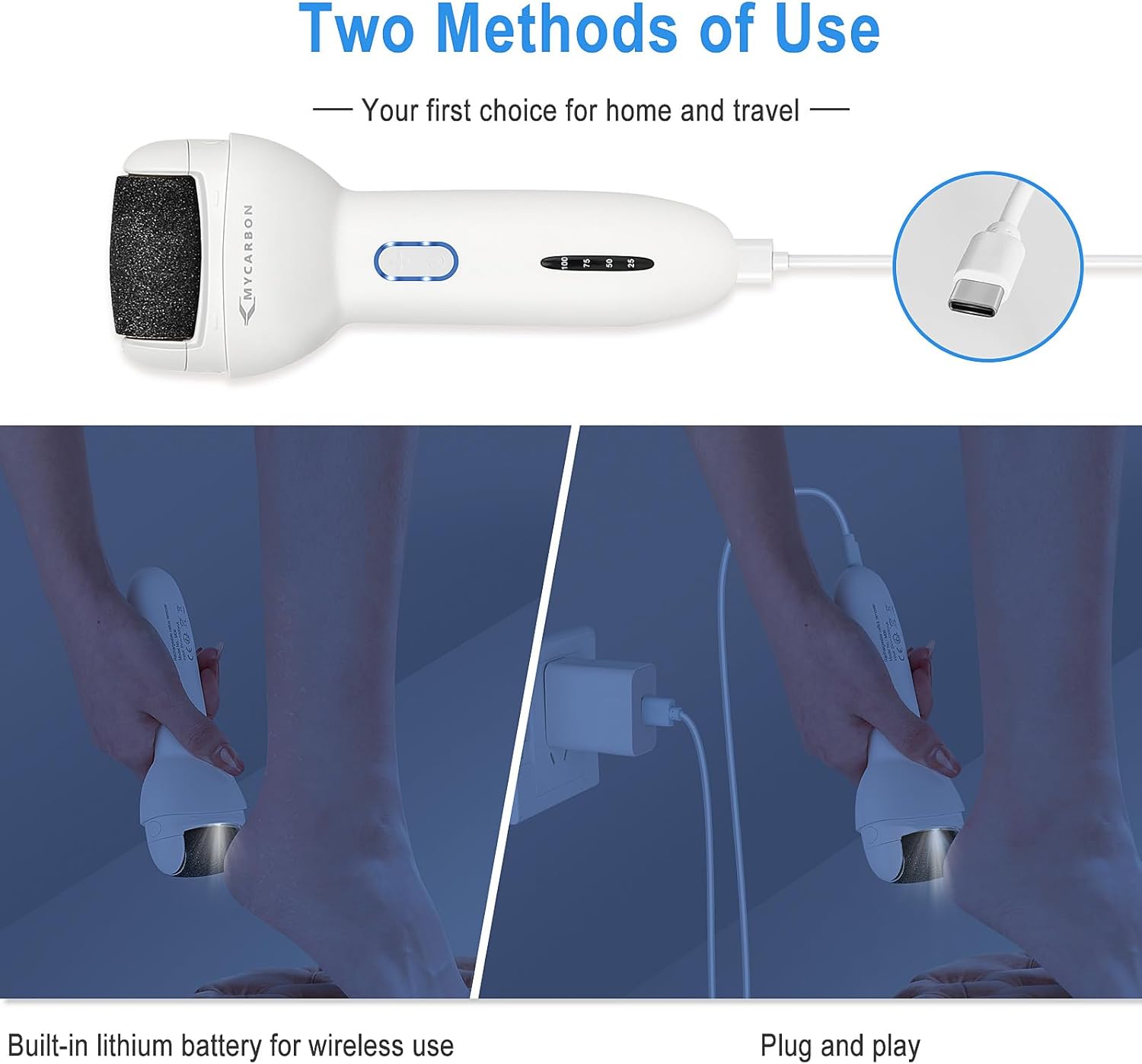 Digital Battery Display + Plug and Play—LED display lets you see the remaining battery capacity(100%, 75%, 50%, 25%). Support plug-and-play, when the battery is lower than 25%, you can plug in and then continue foot care, no need to wait for a long time to charge.