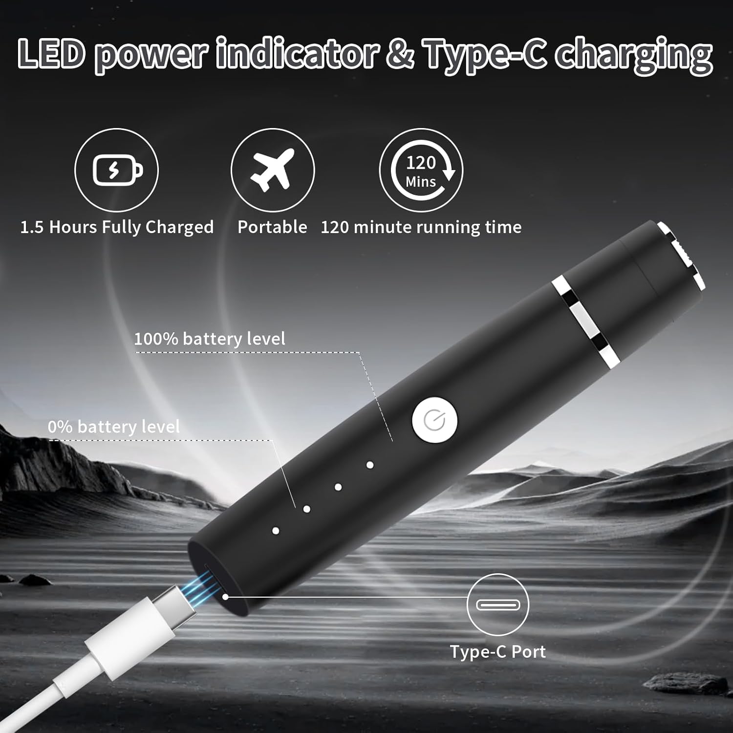 Rechargeable: Features a Type-C charging port and LED indicator to display battery level. It can be charged using a power bank, phone charger, or car charger. A full charge takes 1.5 hours and provides up to 120 minutes of use.