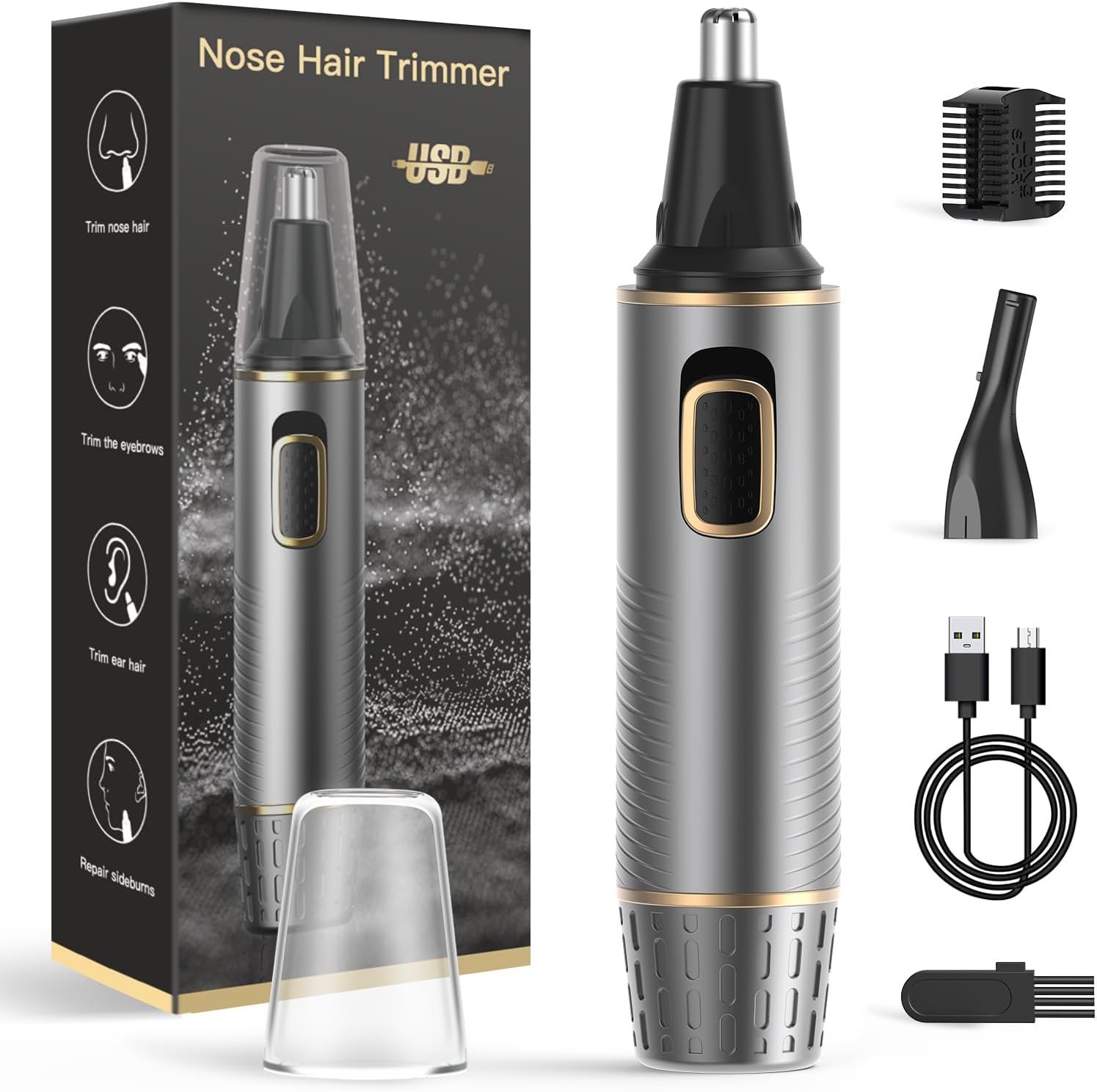 2 in1 multifunctional nose hair trimmer for men ,a high quality product which can be used for long time.USB-C charging, you can charge the trimmer by your computer, your wall charger or mobile power.360°rotatable design,remove your hair safely and accurately.No pain,won’t irritate your skin or hair.Small and delicate, easy to carry or travel.Black Gold is classic color ,never out -of-date.Suitable for all adults,including men and women.
