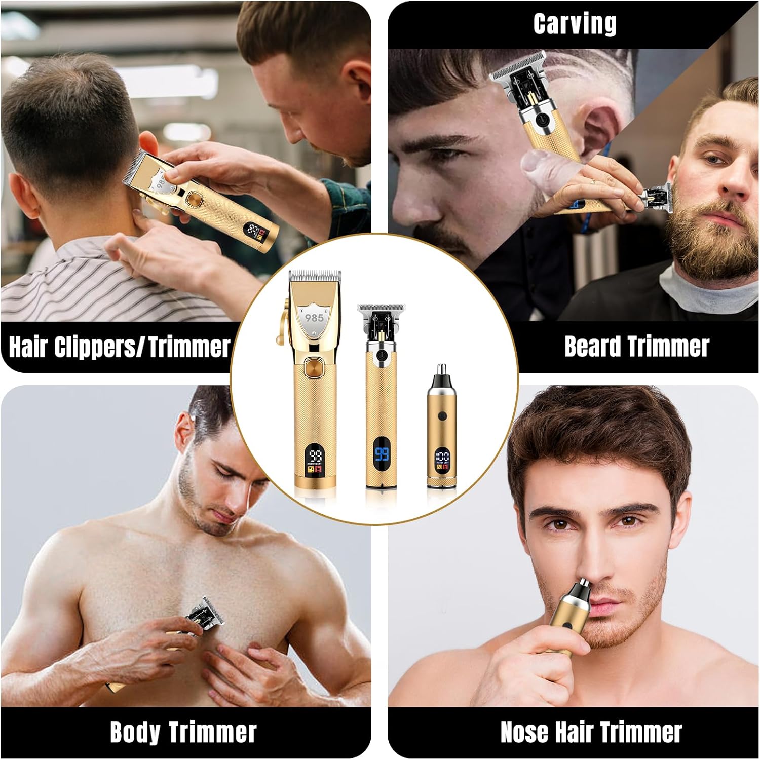 Professional Hair Clippers Hair Trimmer Set : The barber hair clippers grooming kit includes cordless hair clipper,hair trimmer,nose hair trimmer.Cordless hair clipper can be used to trim your hair and beard,with 4 levels to adjust the tooth pitch (0.45-0.8 mm).T blade hair trimmer is also a beard trimmer for men that can be used on haircut,beard trimming,sideburns,precise trimming.Nose trimmer is used to gently and accurately trim nose hair.The shavers set is suitable for barbershops and home