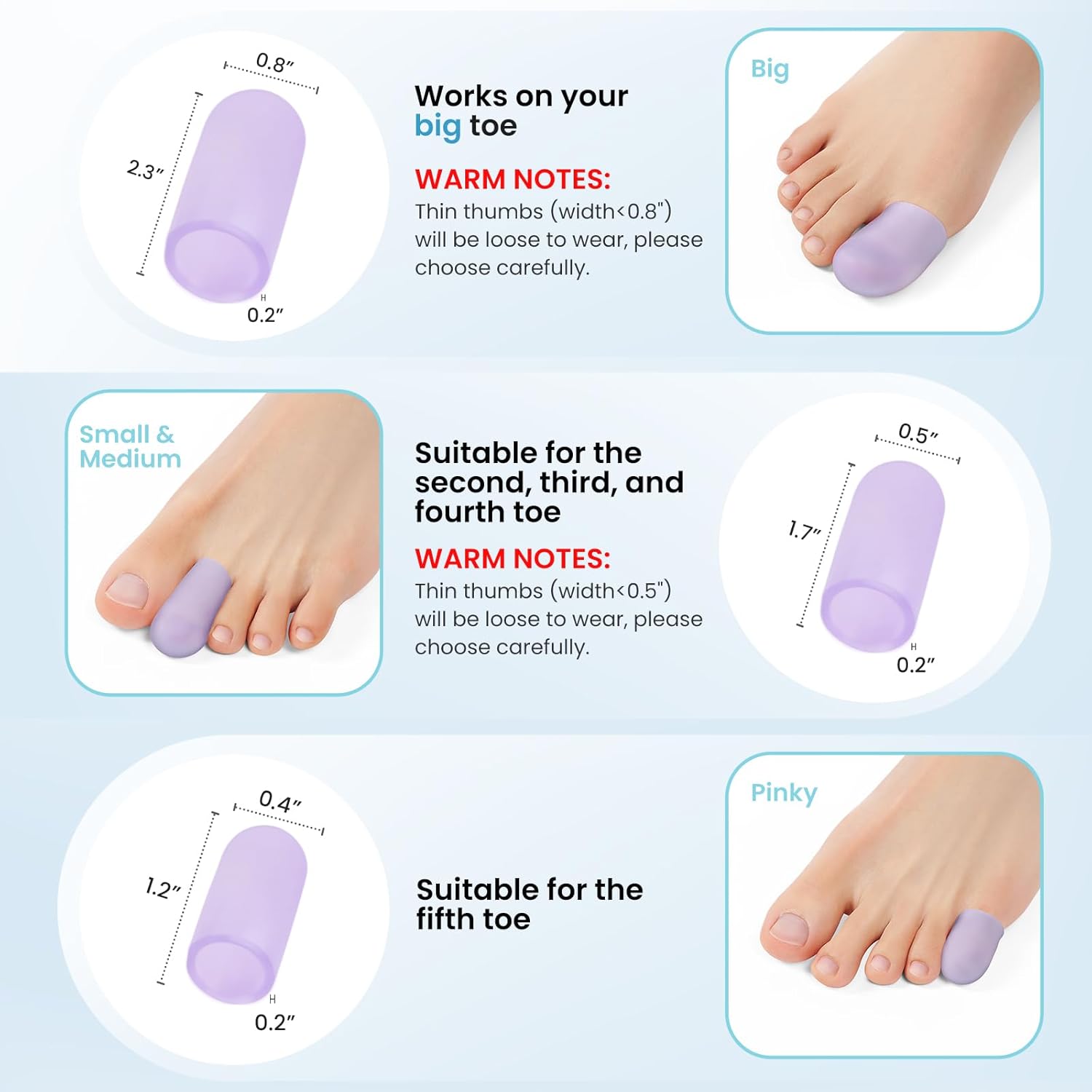 Soft Gel Material: Promifun Toe covers made of soft and durable medical-grade silicone which is latex free! Toe sleeves stretch and slip on easily, and are reusable and adjustable too