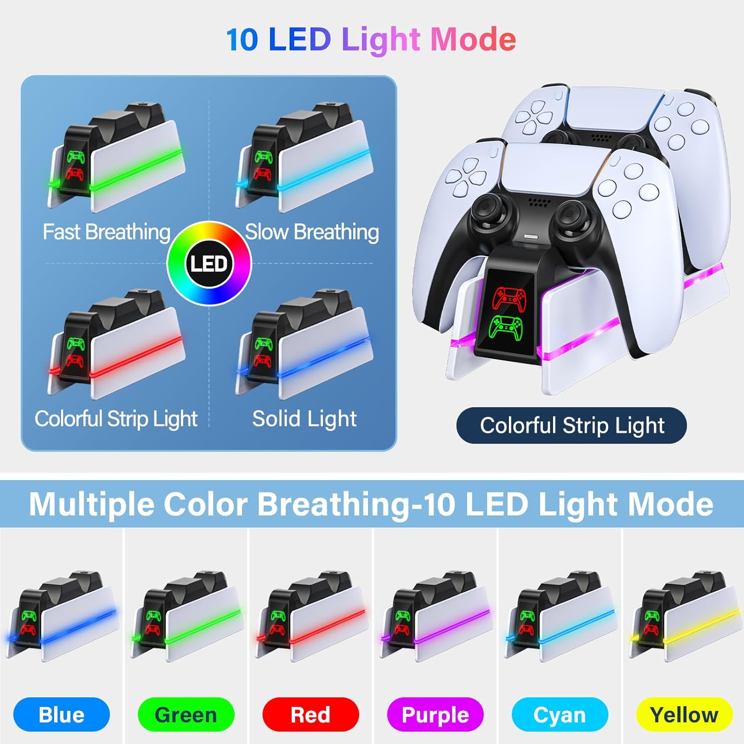 PS5 Charging station with 10 LED Light mode: This PS5 controller charger has unique lighting effects, which has 4 LED light mode: 3 solide mode(blue/green/red) and 1 breathing light mode. With this ps5 charging dock can allow you to choose the led light mode you like.(and you can also choose to turn off the LED lights to charge) This ps5 controller charging station has stylish design and its unique color lights add a sleek aesthetic to your PS5 controller