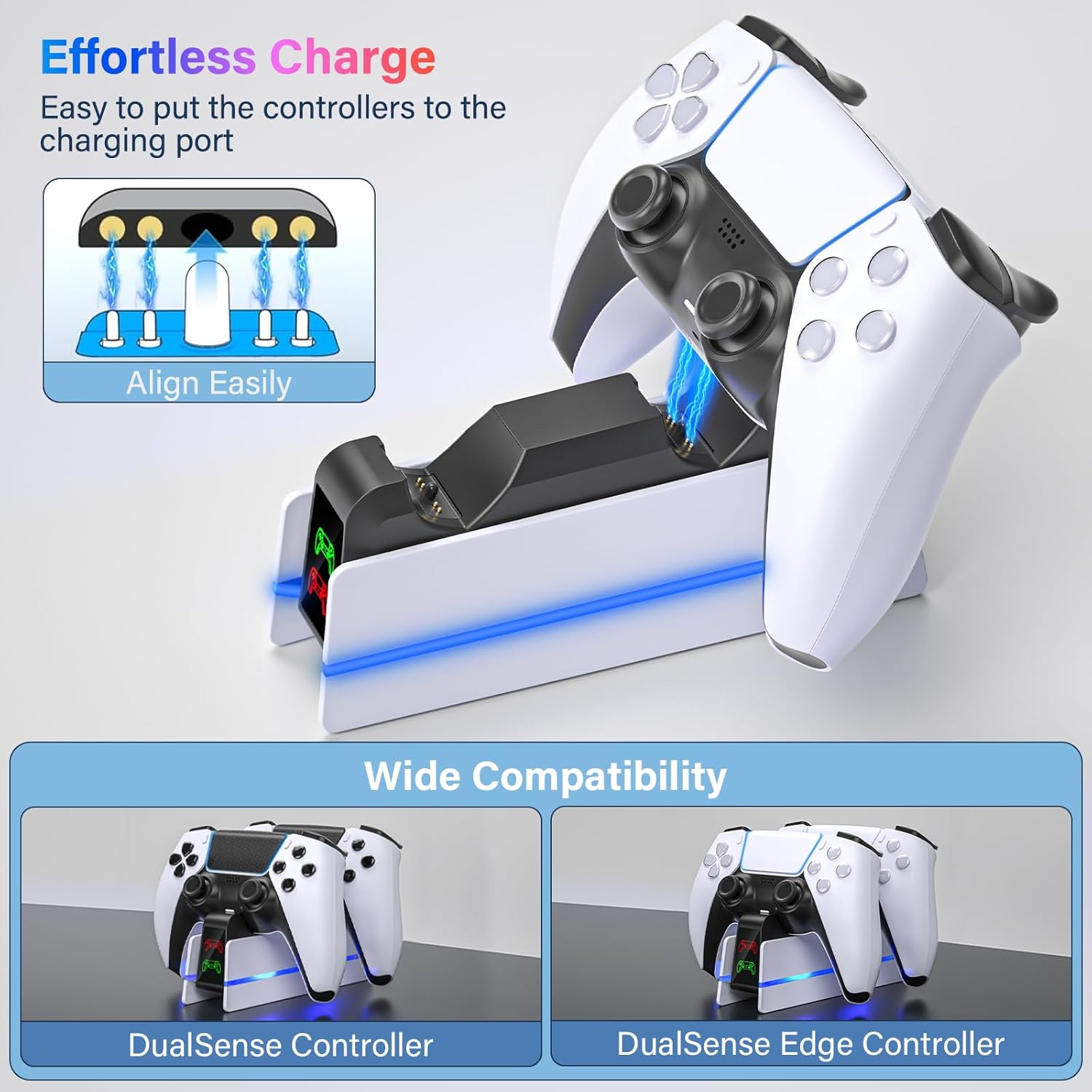 Compatible with Dualsense/DualSense Edge Controller: This PS5 controller charger is specially designed to charge dual ps5 Dualsense/DualSense Edge controller at the same time. Upgrade Playstation 5 charging dock is compact and taking up less space. It is a must-have PS5 accessory for PS5 controller. With this ps5 controller charging station, which can make you can immerse yourself in gaming