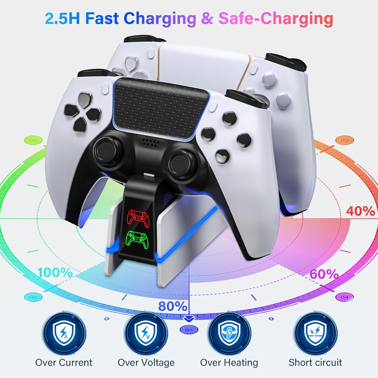 2.5H Faster Charging & Charging for Dual PS5 Controllers: This PS5 controller charger is specially designed to charge for dual PS5 controllers simultaneously. PS5 Accessories Kits charge up to 2 PS5 wireless controllers in just 2.5 hours. PS5 controller charging station included USB cable, which can get power from the front or back of PS5 console, original AC Adapter, laptop,etc. With this ps5 controller charger station it can ensures that you can charge for ps5 controller at any time