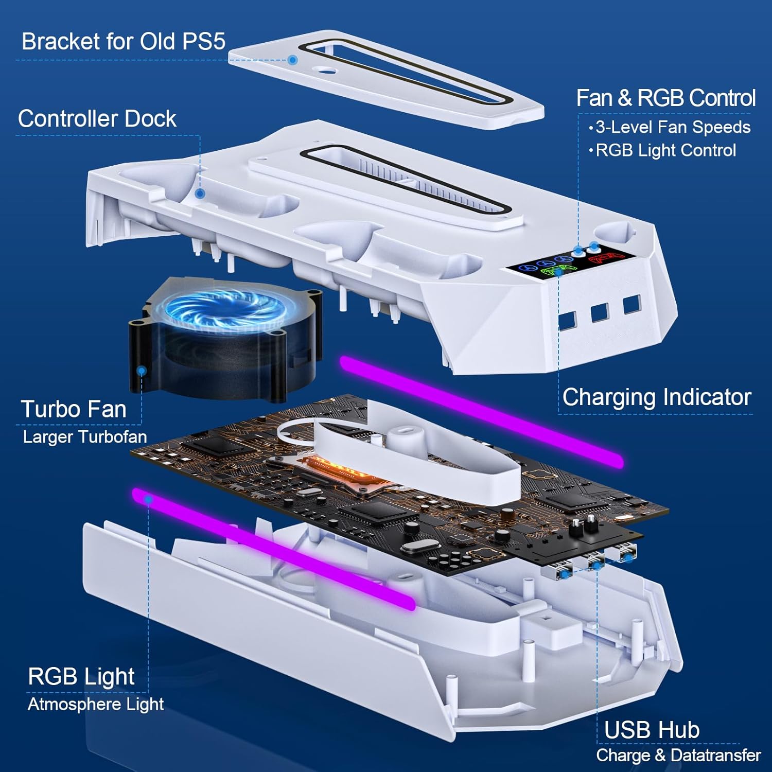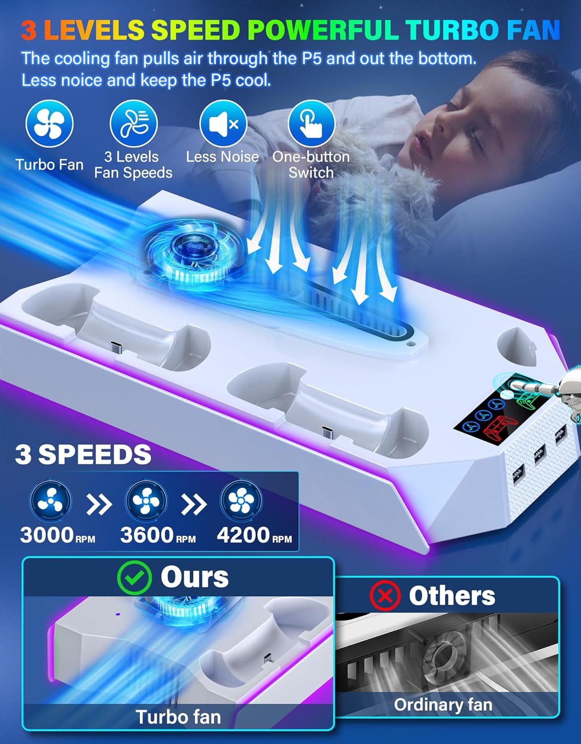 PS5 Slim Cooling Stand With 3 USB Hubs & 3 Levels Fan Speeds – The ps5 cooling station with cooling fan features an upgraded coolling fan with 3 levels adjustable speeds (high, mid, low) to cool down your ps5 console by dissipating the heated air from the bottom of ps5 console, helping it stay away from overheating and extend service life of your console. Extra 3 USB hubs are provided for this playstation 5 slim stand to charge ps5 controllers, hd camera, phone, headphone,etc