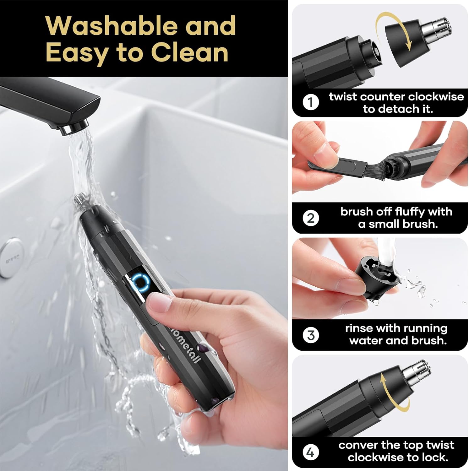 IPX7 Waterproof & Easy Cleaning: Nose hair trimmer for men/women is waterproof and fully washable, Can be used in Wet/Dry conditions. Remove the head and the independent blade is detachable, brush away excess hairs with the included brush, and rinse the body with water to clean it. The trimmer comes with a dust cap to protect the trimmer head.