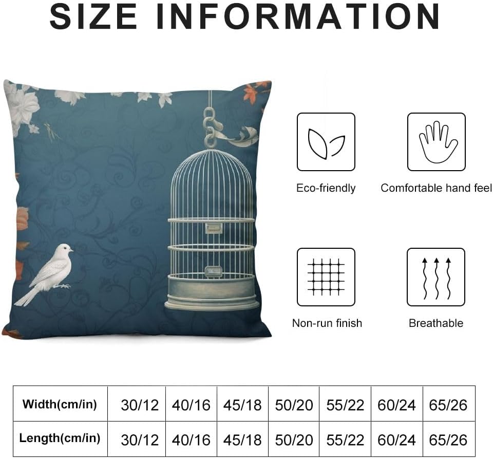 The DIXMOR Romantic Throw Pillow Cushion Cover is a stylish and trendy home decor accessory. Made of high-quality short plush, it offers a soft and smooth touch. The French style love theme design features a bird cage and dove flying out with swirls, adding an elegant touch to any environment. Perfect for living rooms, bedrooms, study rooms, lounges, sofas, cars, and more. The invisible zipper design allows for easy removal and cleaning. This cushion cover is wrinkle-resistant, fade-resistant, and durable, ensuring it stays in great shape even after multiple washes. Available in a beautiful blue indigo color. Hand wash or machine wash with a maximum temperature of 45ºC. Do not bleach or soak for a long time.