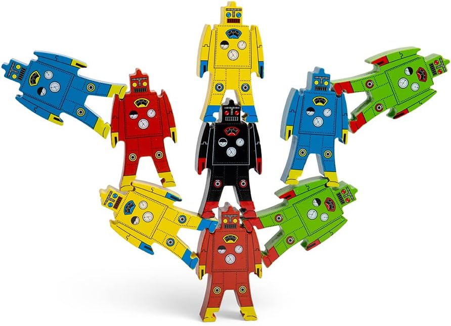 Practice balancing and stacking with Schylling’s colorful, wooden Stacking Robots! Try the patterns on the box, or your own stacking creations. This bright and durable set provides endless building fun!