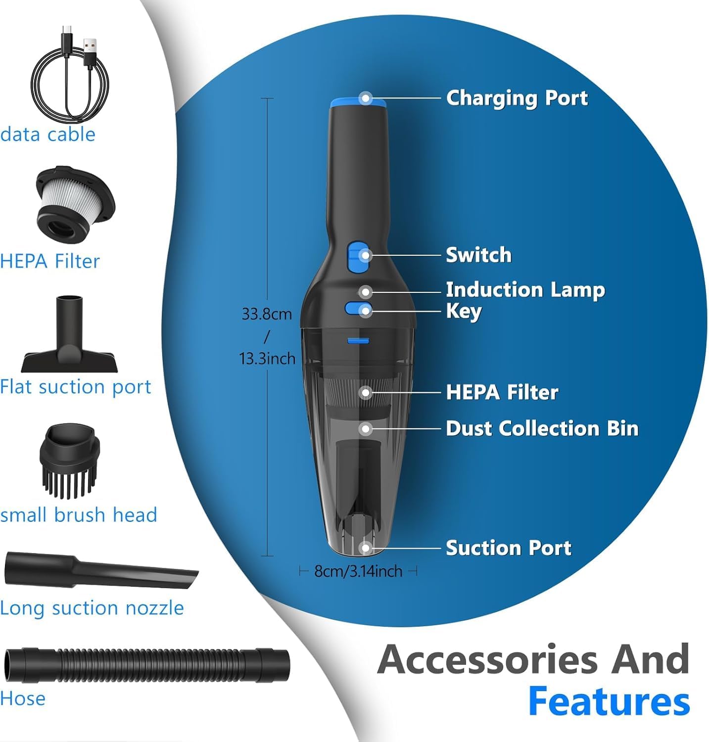 STRONG SUCTION & QUIET OPERATION: Our cordless handheld vacuum features a high-speed motor that reaches up to 47,000 RPM, generating wind pressure of 10,000Pa. With powerful suction, this handheld vacuum effortlessly removes dust, crumbs, sand, and pet hair, leaving your space spotless. The upgraded air duct design ensures quiet operation, making cleaning tasks both efficient and pleasant