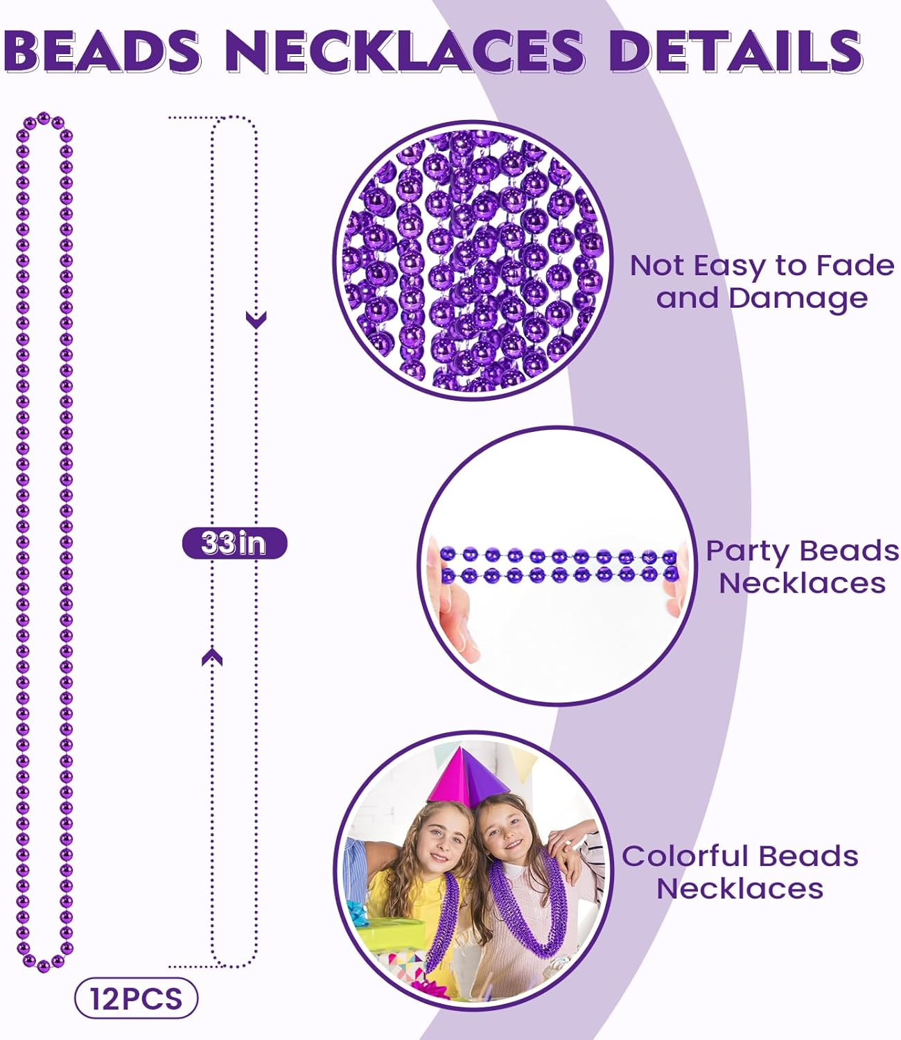 Purple Beads Necklaces: You will get 12 pcs purple bead necklaces, bulk round beaded necklaces, a sufficient number to meet your home and party decoration needs at various holiday events. Ideal Mardi Gras decorations