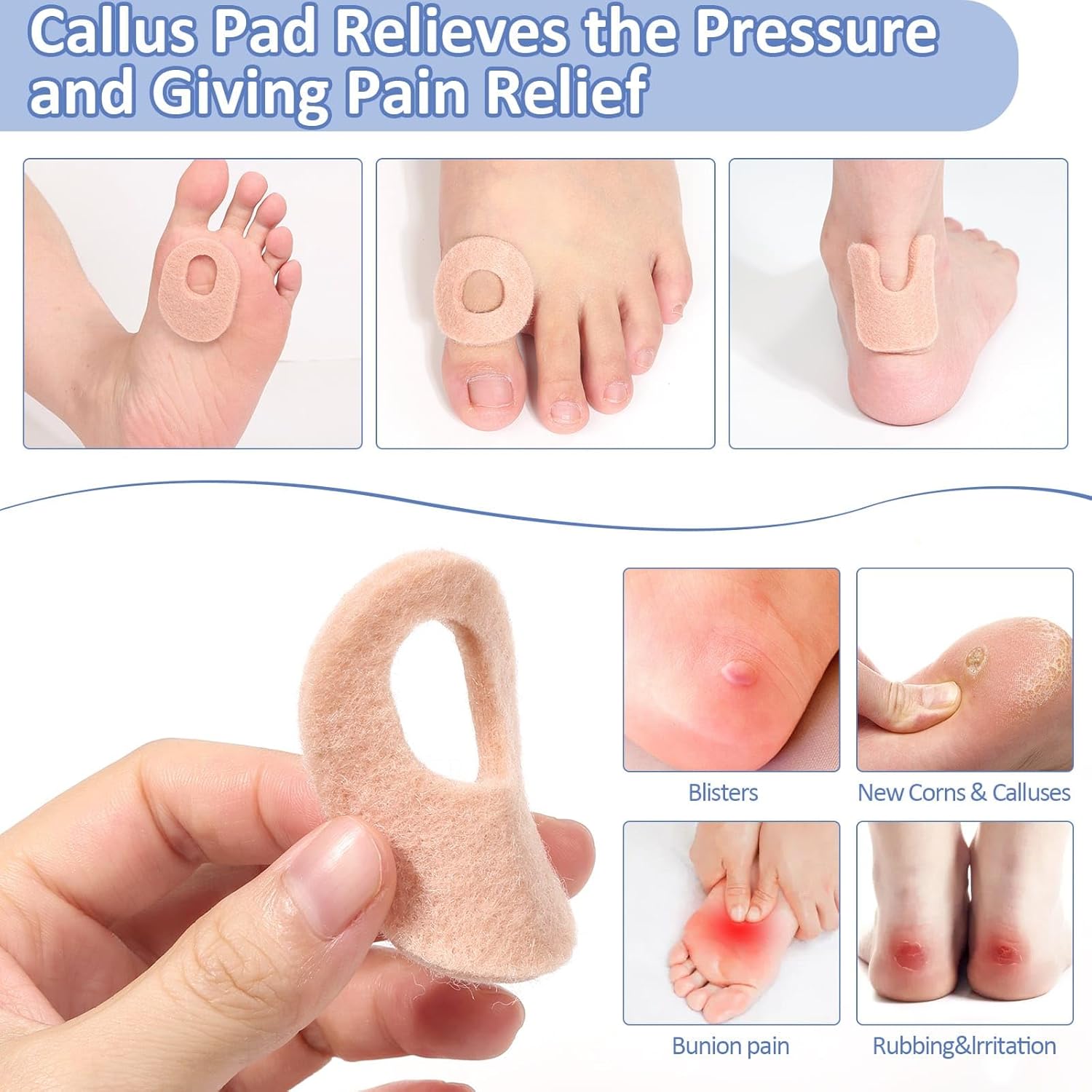 [Padding for Pain Relief] Our callus cushions are designed in 3 different styles, allowing you to replace them according to the specific areas of pain and accommodate different foot shapes, toes, and situations. Featuring design in the center, they provide additional cushioning and protection for areas affected by calluses and corns. Whether applied directly to the foot or placed inside shoes, they help alleviate pain and reduce pressure. These corn pads for toes are small and lightweight, making them easy to carry around without taking up much space