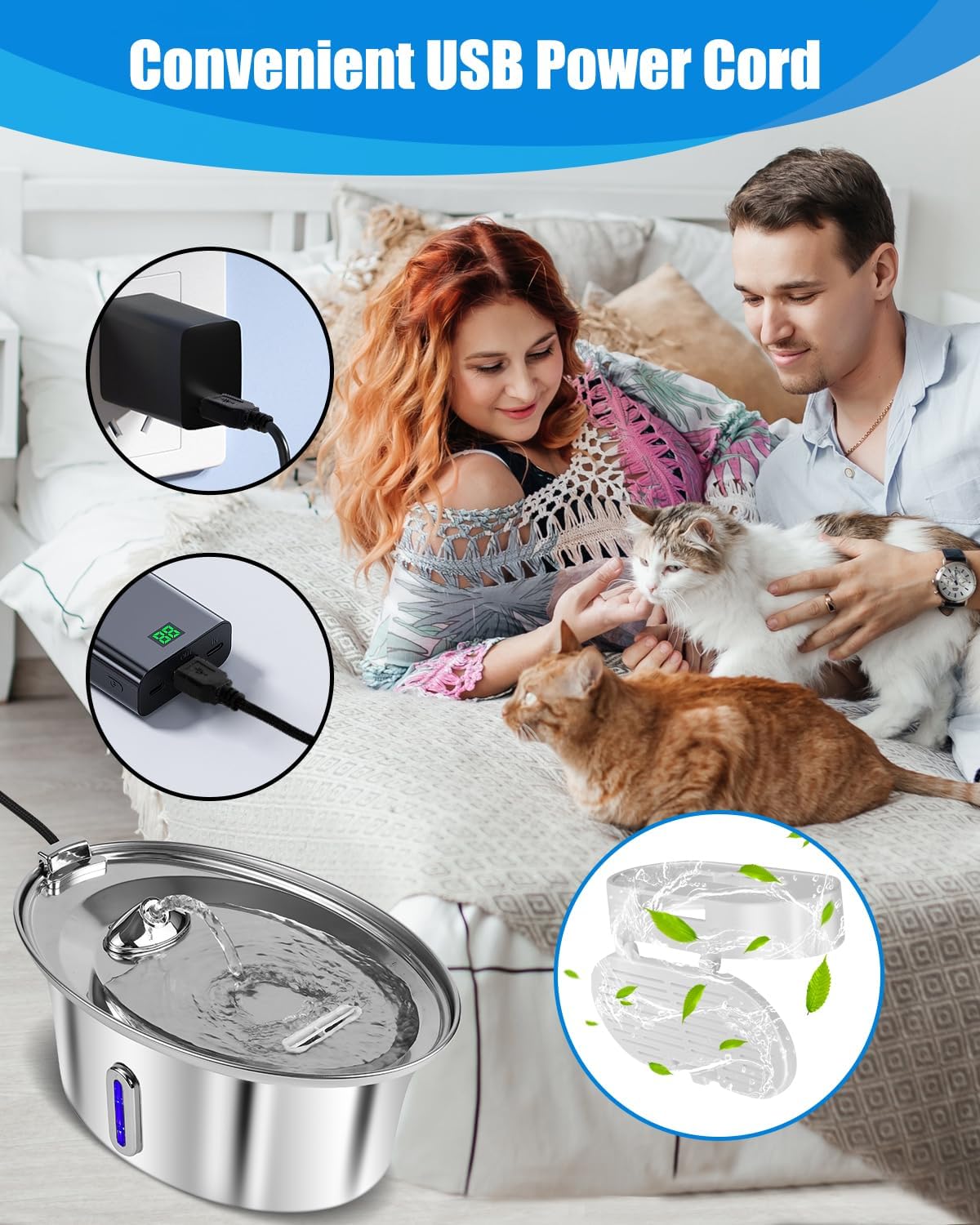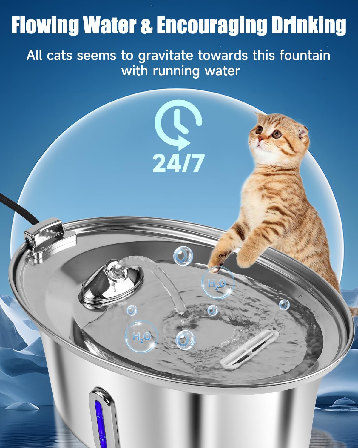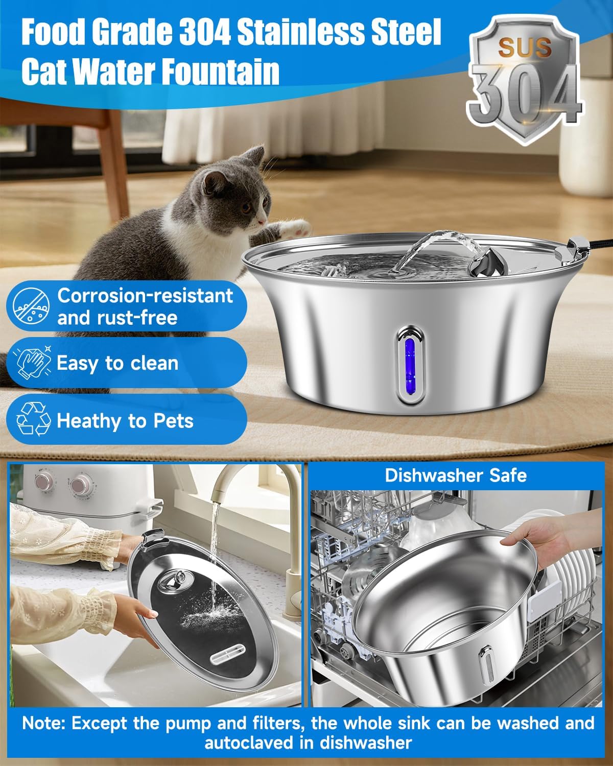 Premium 304 Stainless Steel Cat Water Fountain: WVJ cat fountains for drinking is crafted from food grade 304 stainless steel, safe for your pets; It’s durable and corrosion-resistant, ensuring long-lasting use. Dishwasher safe, making it easy to keep clean and maintain.
