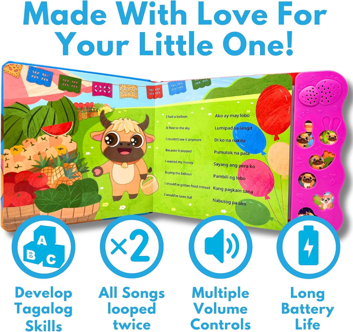 6 CLASSIC TAGALOG CHILDREN’S SONGS. Tin Tin Learns Tagalog features beloved Tagalog songs for kids that celebrate Filipino culture and language—perfect for babies, toddlers, and young learners. This Filipino baby book includes 6 full-length tracks: Maliit Na Gagamba (Itsy Bitsy Spider), Ang Lobo Ko (My Balloon), Isagwan Ang Bangka (Row Row Row Your Boat), Paa Tuhod Balikat Ulo (My Feet, My Knees, My Shoulders, My Head), Umupo Po Kayo (Let’s Sit Down) and Maningning Na Munting Bituin (Twinkle Twinkle Little Star). A musical Tagalog book for kids that brings joyful learning to every home.