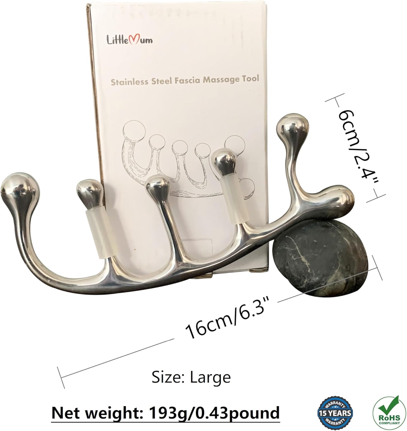 Provides myofascial release for muscle tension in various areas, including the neck, shoulders, forearms, legs, and calves. The five round massage heads, arranged in an ergonomic curve, target muscle trigger points and enhance blood flow