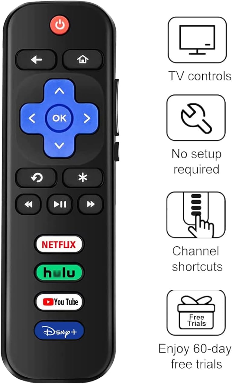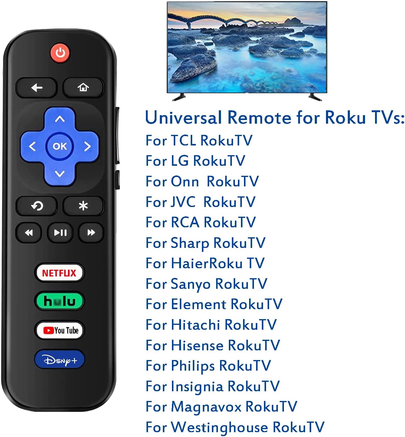 Work with: Universal Remote Compatible for RokuSeries TV, for TCL/LG/Onn/JVC/RCA/Sharp/Haier/Sanyo/Element/Hitachi/Hisense/Philips /Insignia/Magnavox/Westinghouse RokuTV, for above 15 Brands All R0KU Smart TVs.