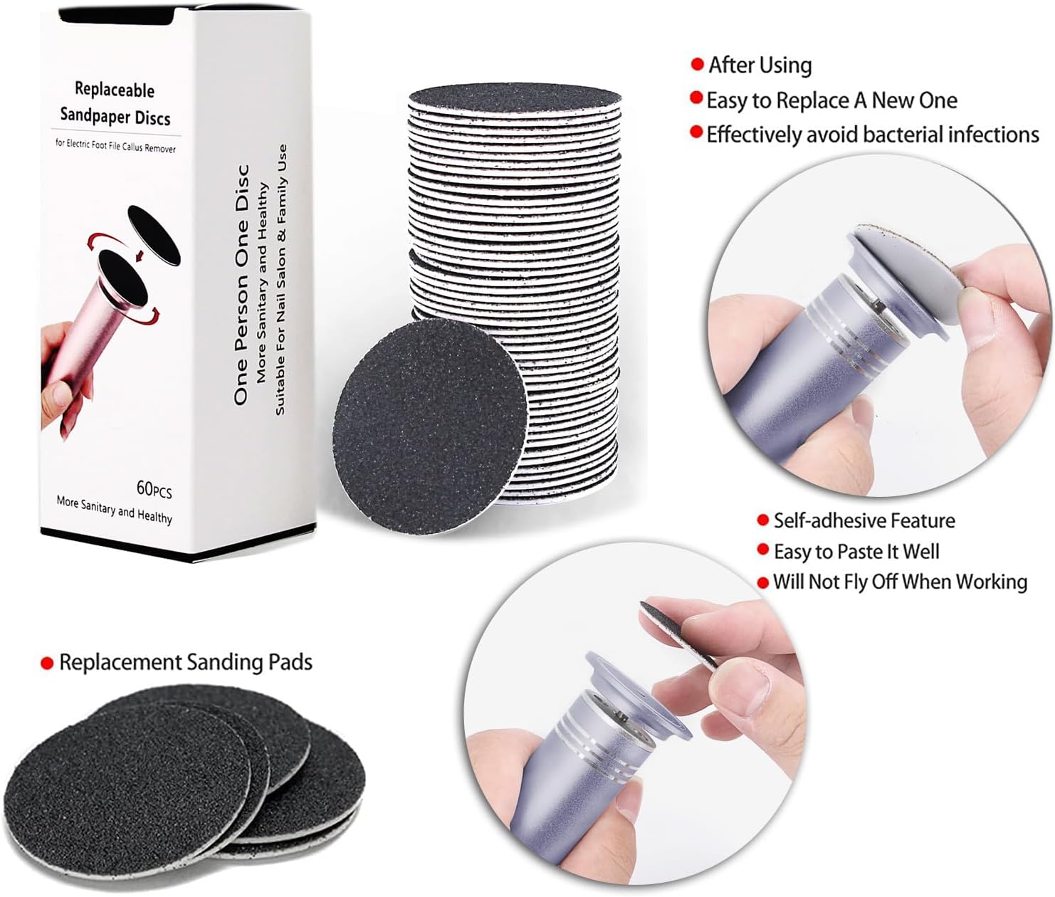 60 Replaceable sandpaper discs have self-adhesive backing for easy replacement. High quality sandpaper discs remove dead skin without leaving scratches.1 person 1 sandpaper, easy to use and clean.