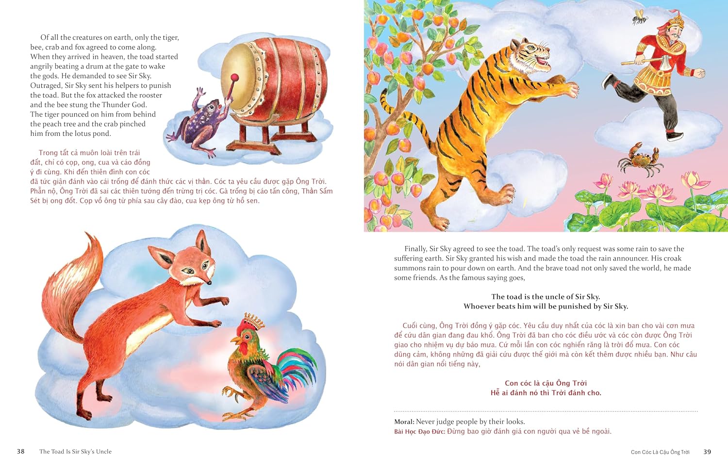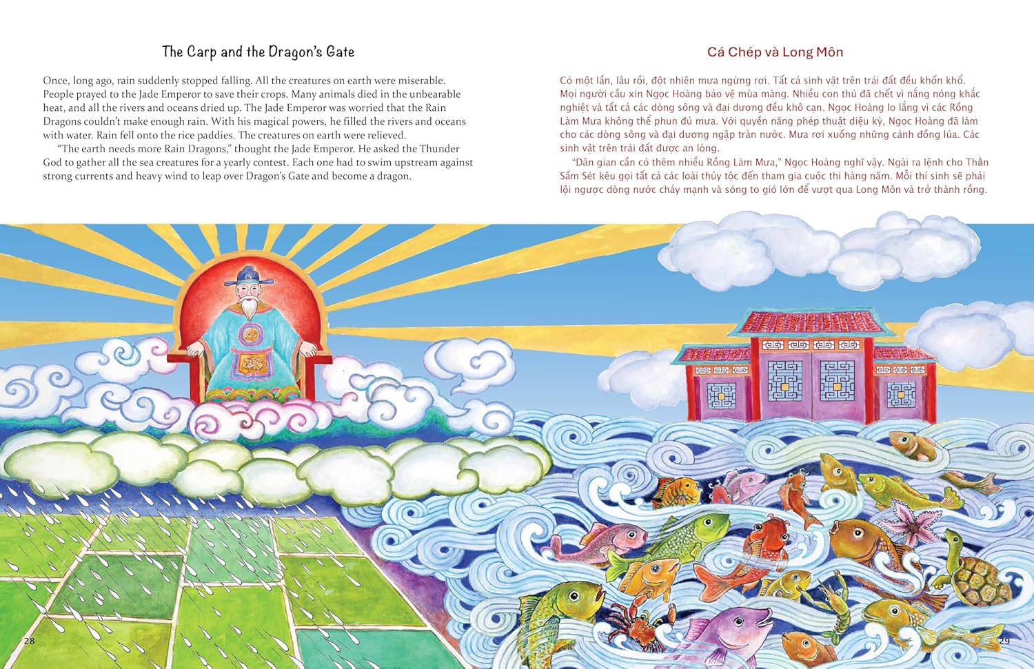 Thach Sung and the Cracked Earthen Pot — A greedy man learns that it’s better to be satisfied with what you have than to yearn for the unattainable.The Carp and the Dragon’s Gate — A fish turns into a dragon, showing that with hard work and perseverance seemingly impossible goals can be achieved.The Toad Is Sir Sky’s Uncle — A brave toad saves the world from drought, showing that we should never judge someone by their looks.And seven more fascinating tales!