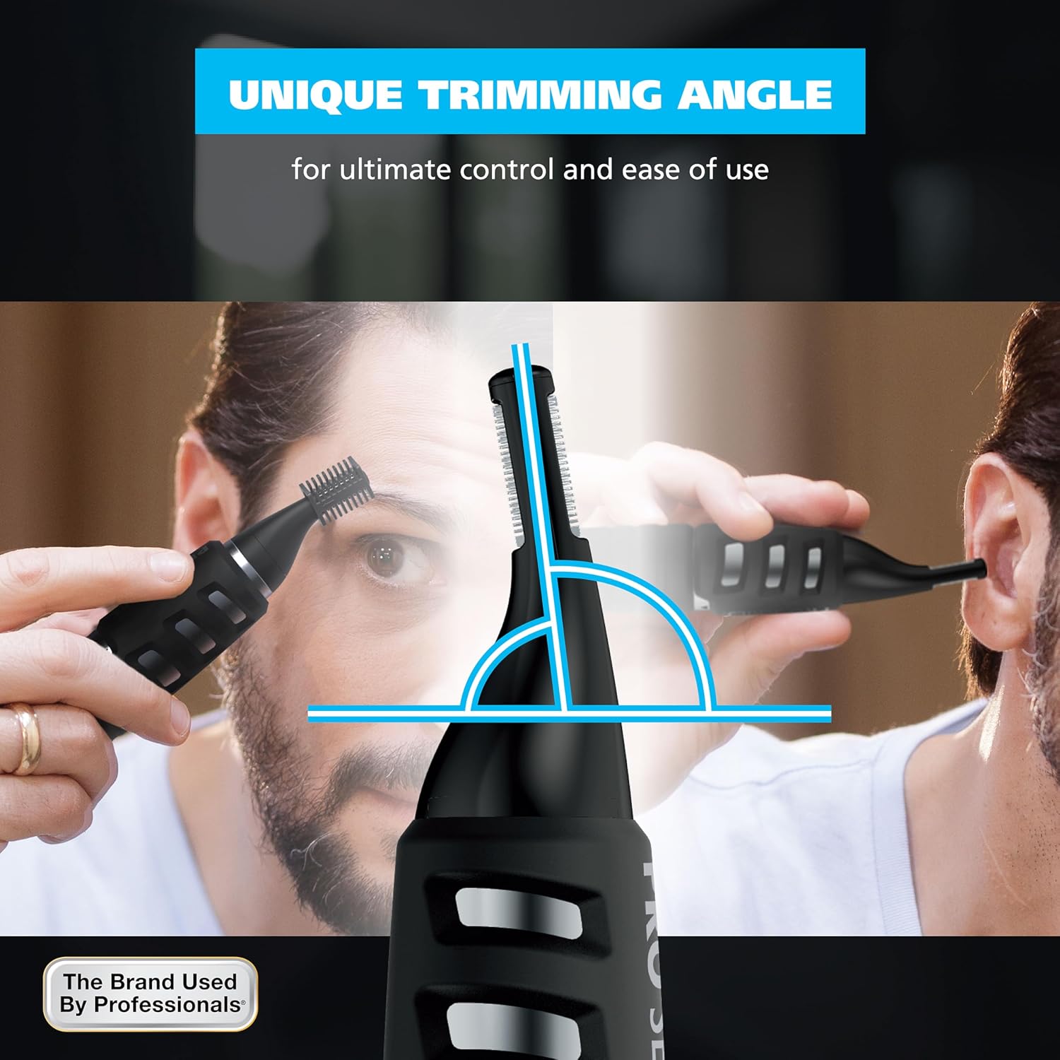 The Wahl DualTech® Pro Series® 2 in 1 Lithium Dual Sided Eyebrow Trimmer and Nose Hair Trimmer for Men offers the perfect solution for precise and comfortable grooming. Its comfortable rubber grip body ensures a secure hold, allowing for easy trimming of nose, ear, and eyebrow hair. The DualTech® Eyebrow Trimmer, with its precision double-sided detail trimmer blade, allows you to trim hair at any angle. The angled head design provides a more comfortable grooming experience when trimming eyebrows, nose and ear hair. To evenly trim eyebrow hair, add the included eyebrow trimming guide to the DualTech® trimming head and achieve up to 4 different cutting lengths by rotating the guide between the long and short teeth sides. Additionally, a separate rotary trimmer head attachment is included in this grooming kit for painless removal of unwanted nose and ear hairs. The removeable trimmer heads are easy to clean with rinseable high-quality stainless-steel blades. Simply remove the heads from the trimmer body, rinse, thoroughly dry and reattach for a hygienic grooming experience. Take this hair trimmer with you on the go and during travel with its cordless Lithium AA battery operation (battery included). Note: We test our Wahl hair trimmers for men for cutting performance prior to packaging with a hygienic fiber. We do our best to clean the product to remove any testing particles, but it is possible a few may remain. They are not hair and can be simply wiped off.