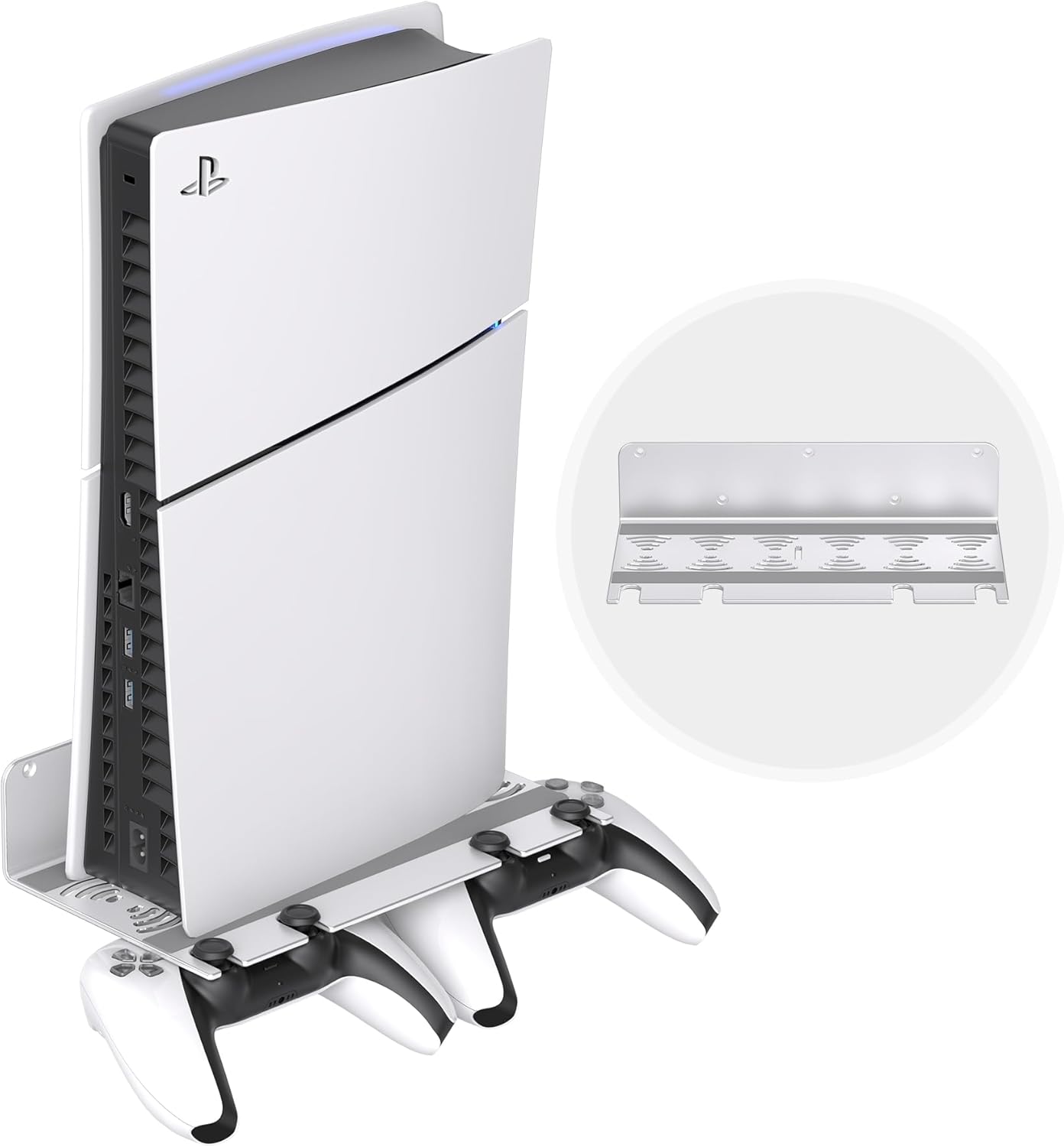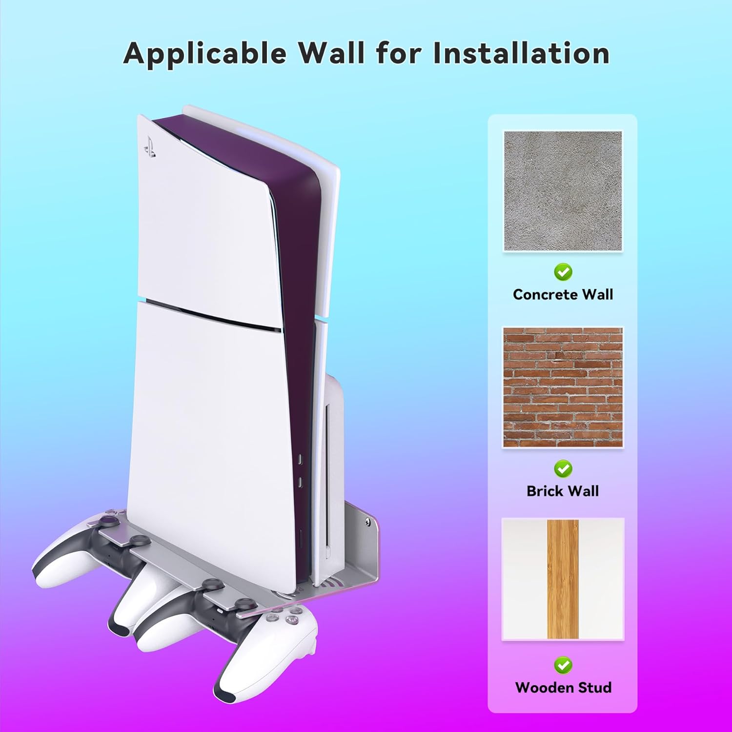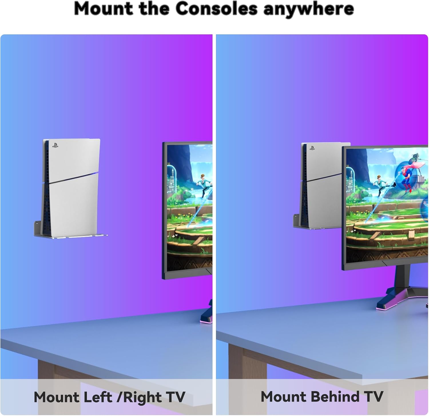Suitable for PS5 : The wall mount kit is compatible with PS5 Slim Digital Edition / Disc Edition / PS5 Pro/ PS5 Original Models . It can mount the console on wall near or behind the TV. The curved design of the wall bracket prevents the device from getting cratched