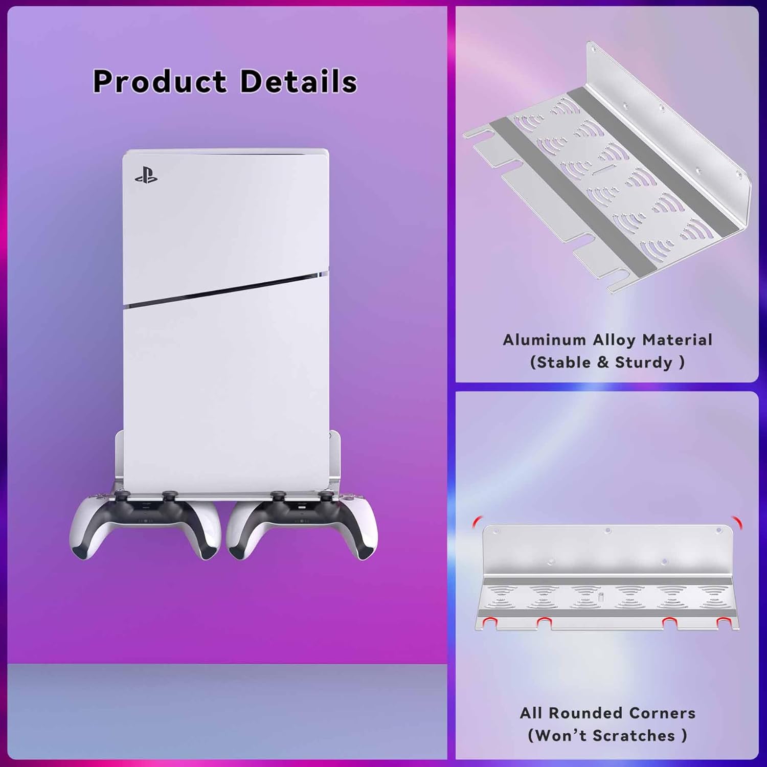 Aluminum Alloy: Our wall stand for PS5 slim is made of sturdy aluminum alloy, with a load capacity of up to 10 kg. When installed correctly according to the user manual, you won’t need to worry about the console falling off the bracket