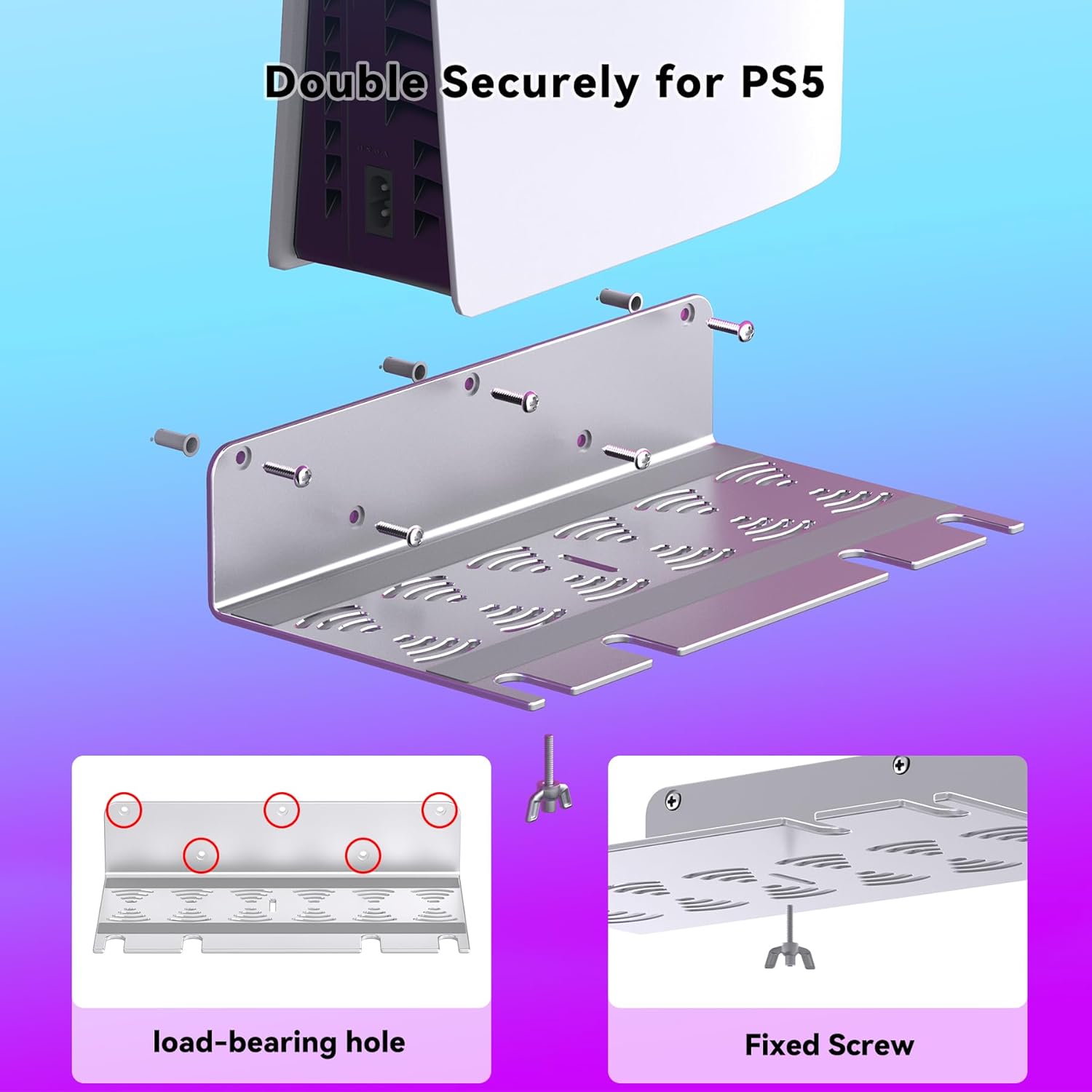 Installation Guide: This wall mount holder for PS5 is suitable for concrete and brick walls. It is easy to install and requires only four steps, as outlined in the user manual. Note: Ensure the fixing screw are tightened into the bottom of the console