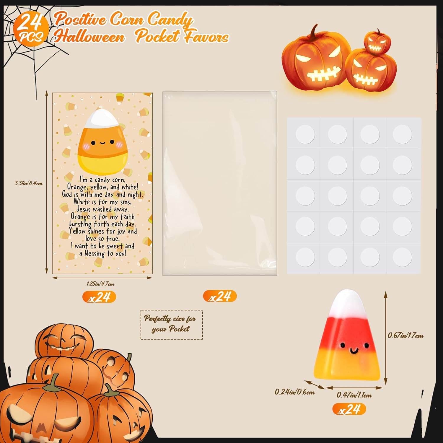 Halloween Fake Candy Gifts: package includes 24 mini resin candy corns, 24 religious prayer cards and 24 self adhesive gift bags, sufficient quantity, suitable for sharing in many occasions such as Halloween party, sunday school, office, etc.