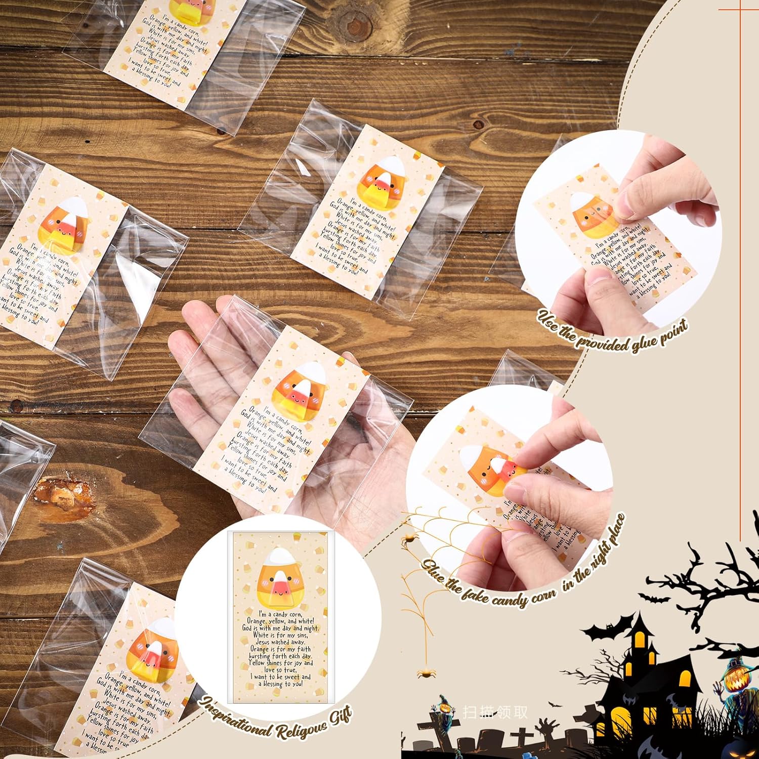 Materials: fake candy corns are made of durable resin material, religious prayer cards 300g coated paper with bright colors; Use the included double sided adhesive dots and opp gift bag to make cute Christian Halloween gifts