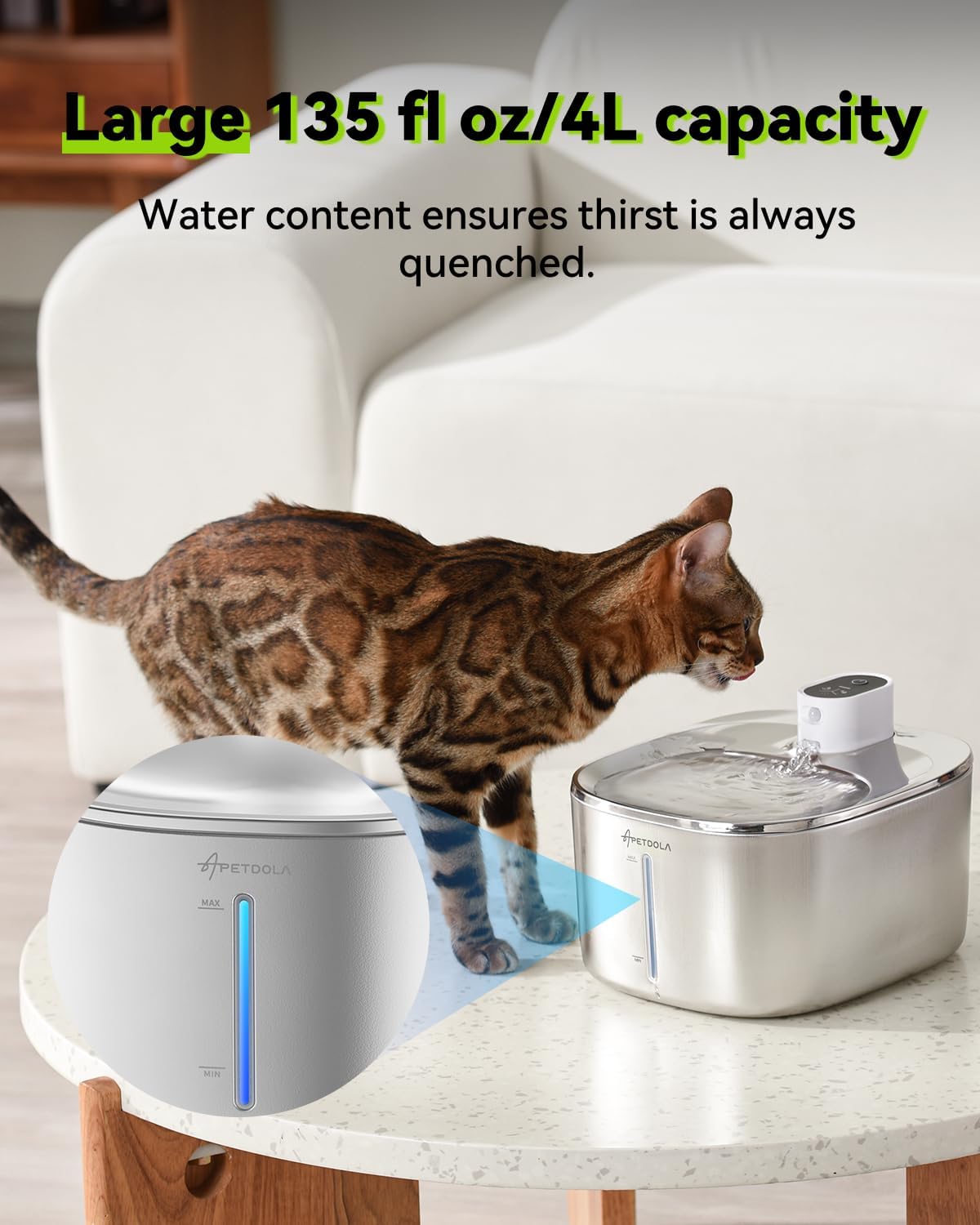[Quiet & Safe] Sleep soundly even if APETDOLA cat water dispenser is right next to your bed. The wide spout and upgraded sound-filtering water pump makes the water flow as soft as a stream, at a barely audible 25dB. When it comes to pet-friendliness, this cordless cat fountain stainless steel is the clear winner. With safe and continued material, it is less likely to scratch or be dirty, making it a long-lasting option.