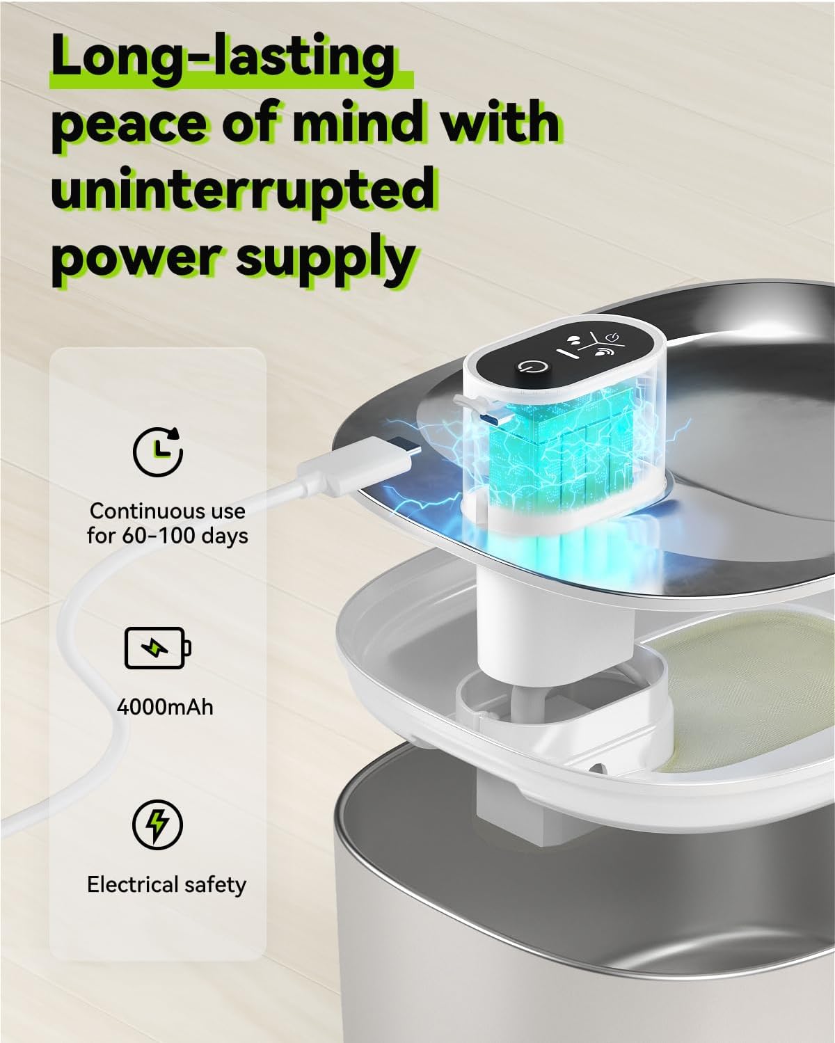 Wireless design, Set It Anywhere, No wires to trip or be chewed. A built-in 4,000mAh rechargeable battery, this stainless steel cat water fountain provides your dogs and cats with fresh, clean water for up to 60-100 days.