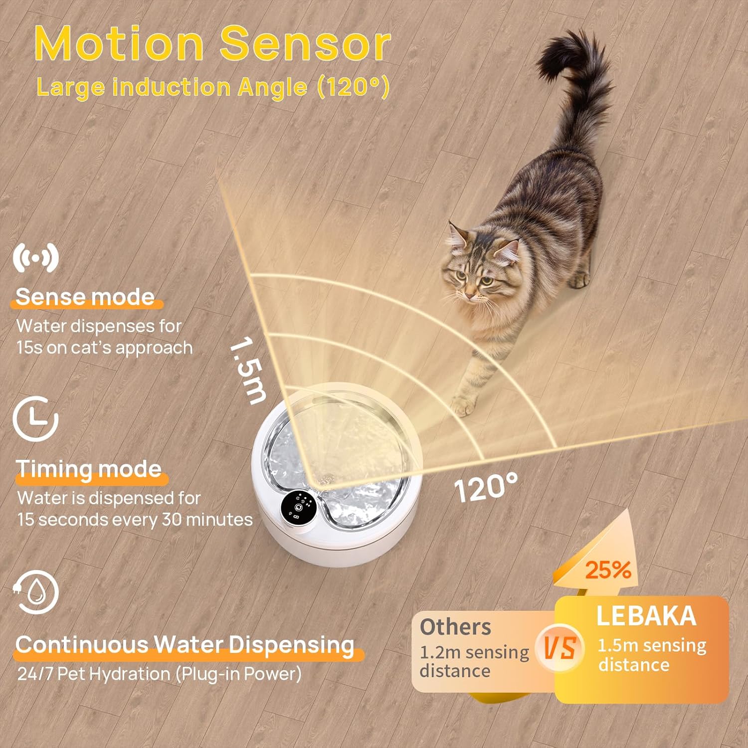 【Smart Hydration Modes】The battery-operated pet water fountain features three working modes to cater to your furry friends’ needs: Sensing mode activates water flow for15 seconds when a pet is nearby, timing mode provides water every30 minutes for15 seconds, continuous mode Continuous Flow provides 24/7 running water, Each mode adapts to your pet’s unique drinking habits, ensuring they always have fresh, engaging water.