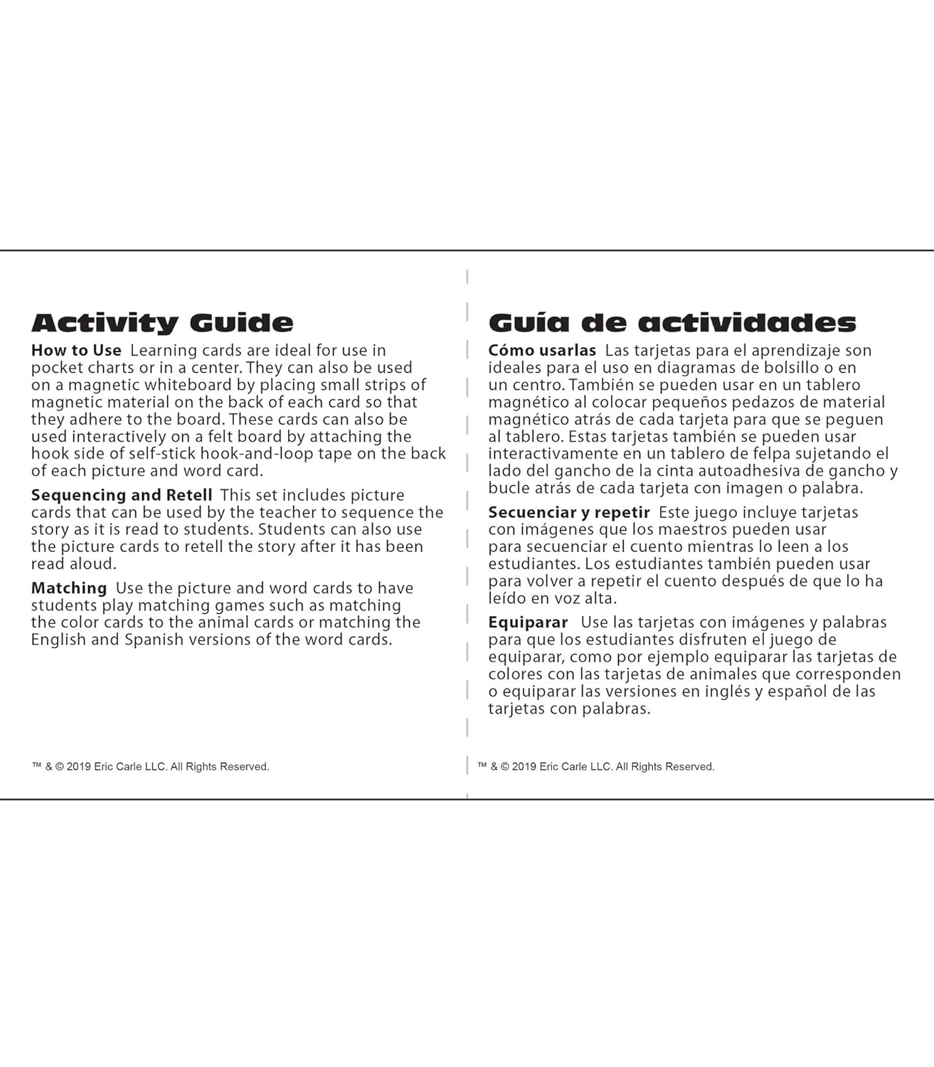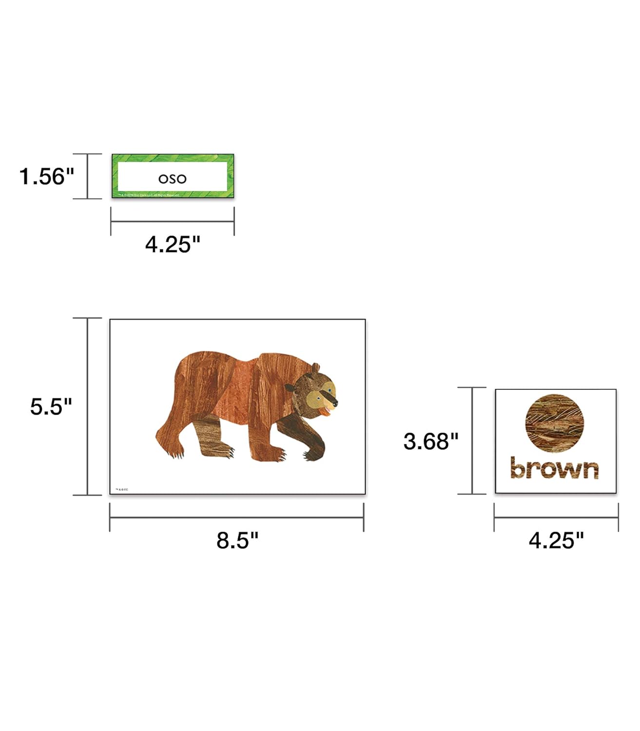What’s Included: The 54pc Brown Bear, Brown Bear, What Do You See?™ Flash Card set includes English and Spanish activity guides, a title card, 11 picture cards, and 2 sets of 9 color word cards and 11 character word cards in both English and Spanish.