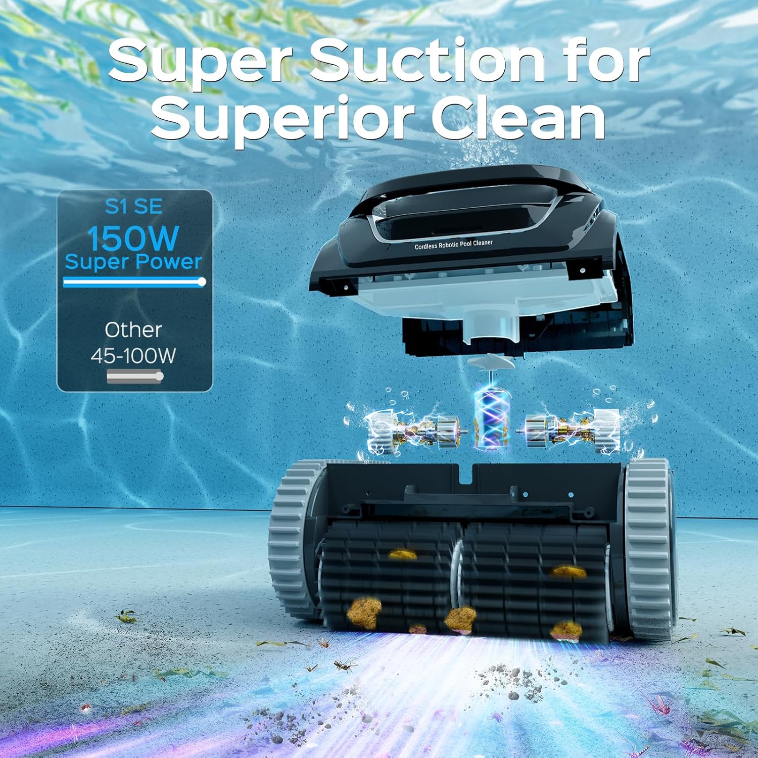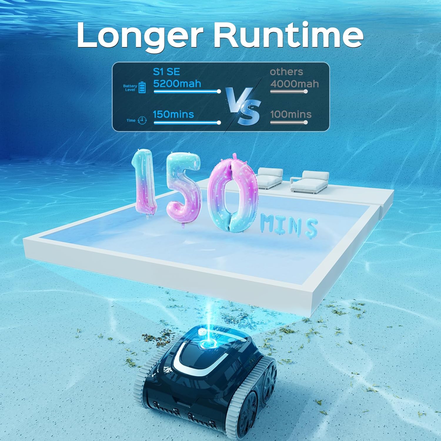 Full Pool Cleaning: This cordless pool vacuum is good at cleaning walls, floors, and waterline. With high-precision gyroscope and infrared sensors, S1 SE intelligently maps your pool’s shape and size, ensuring efficient and thorough cleaning. Achieving an impressive 90% pool coverage.